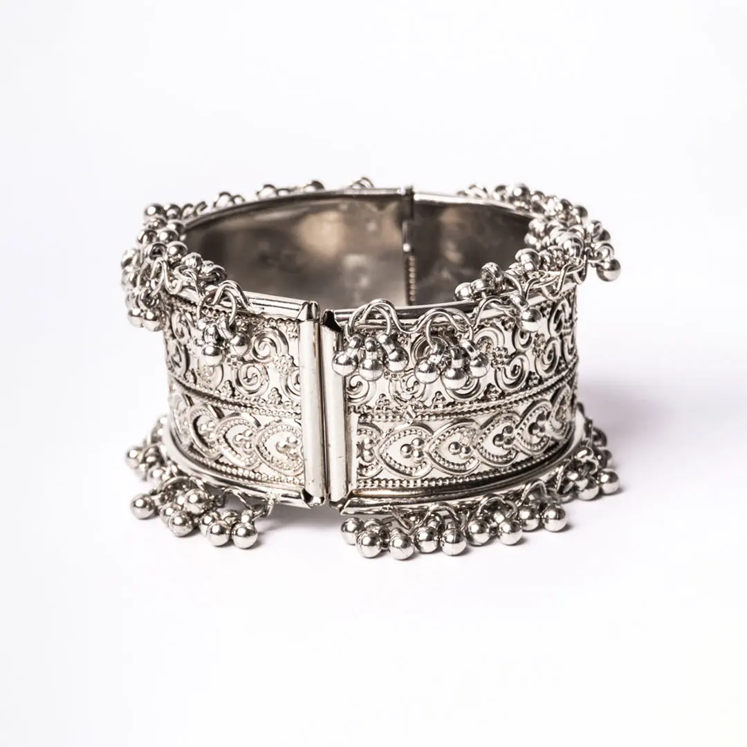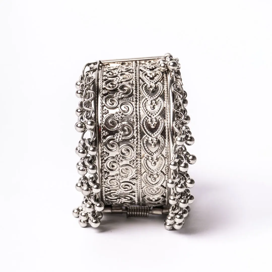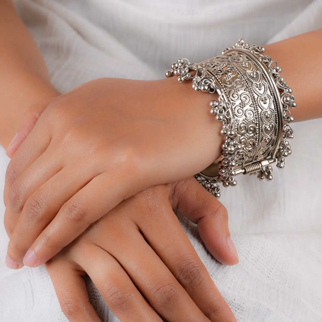 Metal cuff bracelet with fine intricate detailing and oxidised silver tone finish adorned with ghungroos on both the edges