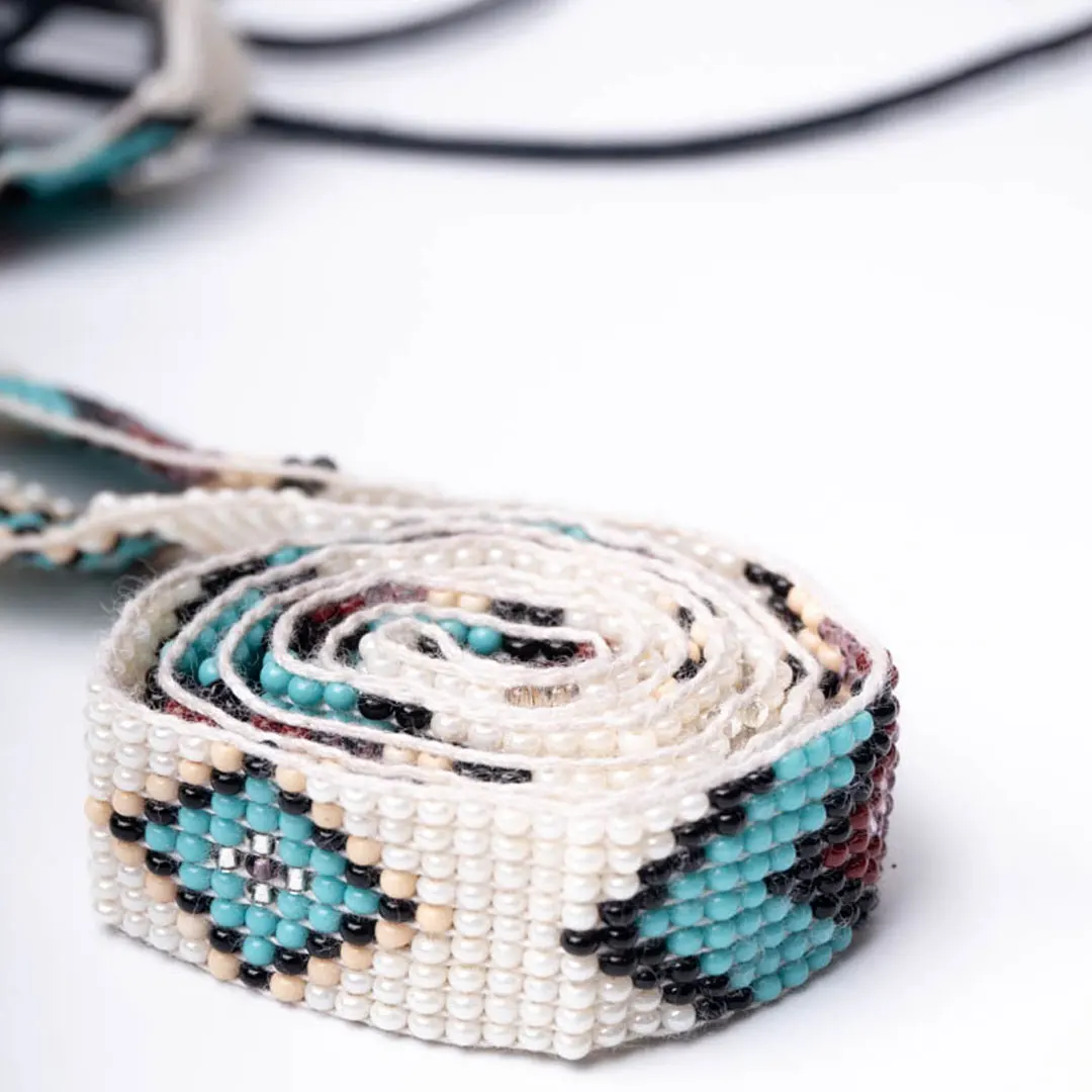 Geometric patterned seed bead belts featuring symmetrical multicoloured intricate geometric patterns and dori closure