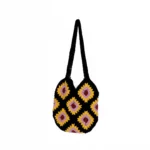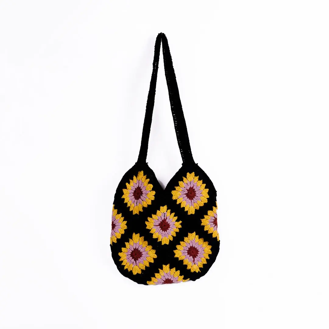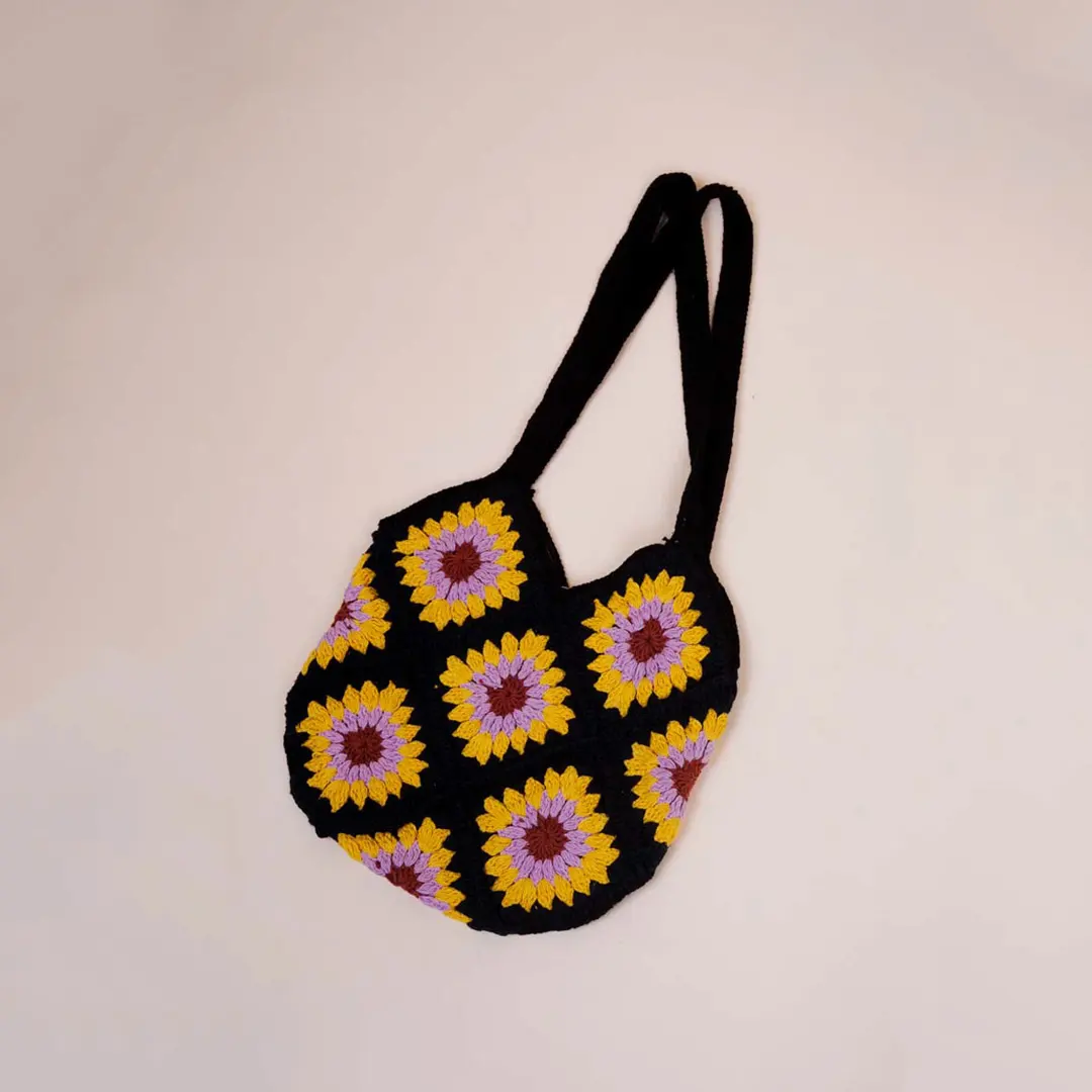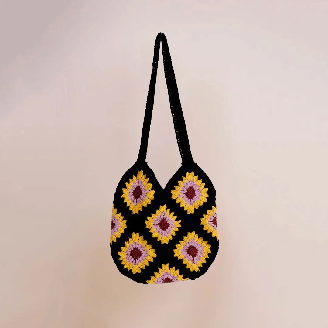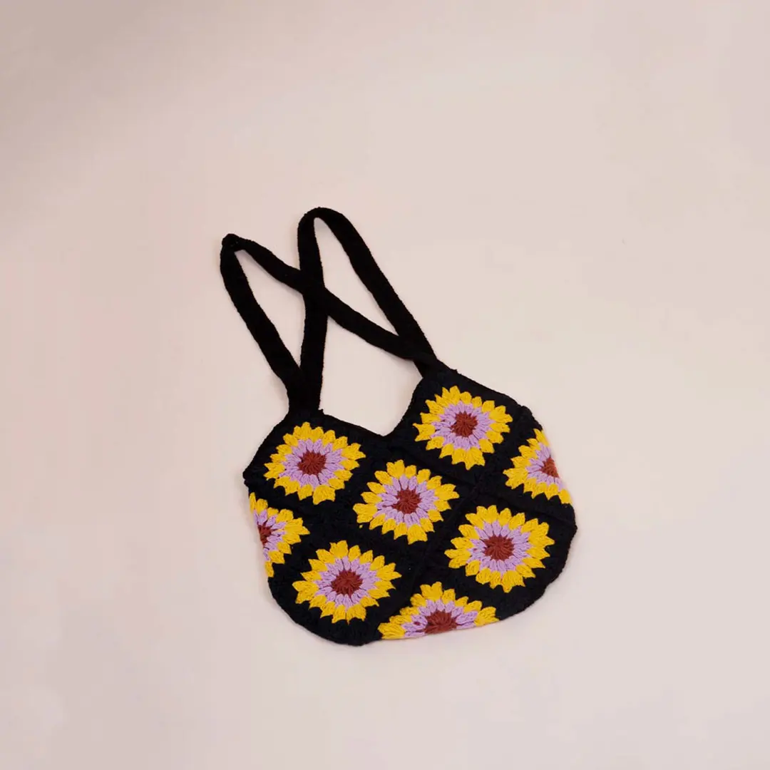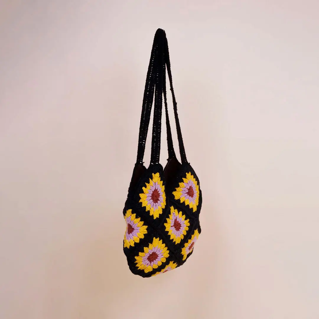 Crochet bag with a striking sunflower-inspired granny square patterns featuring a black base with floral motifs in shades of yellow, lilac, and brown creating a vibrant yet elegant contrast with two sturdy crochet straps and a magnetic lock