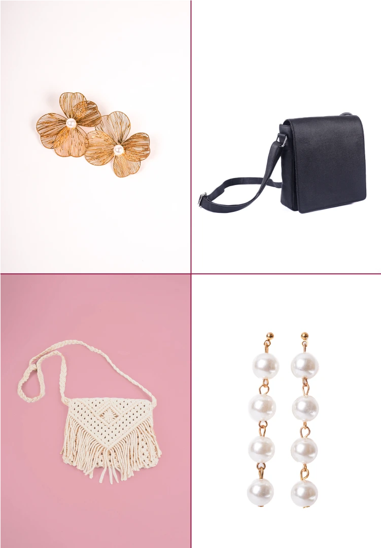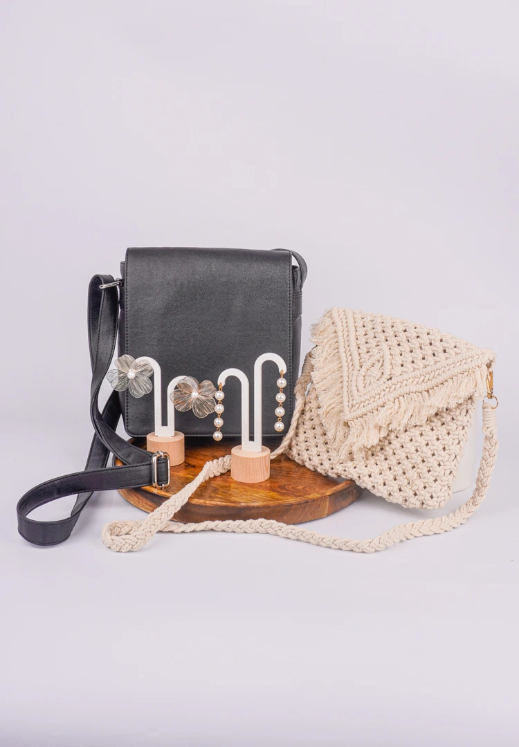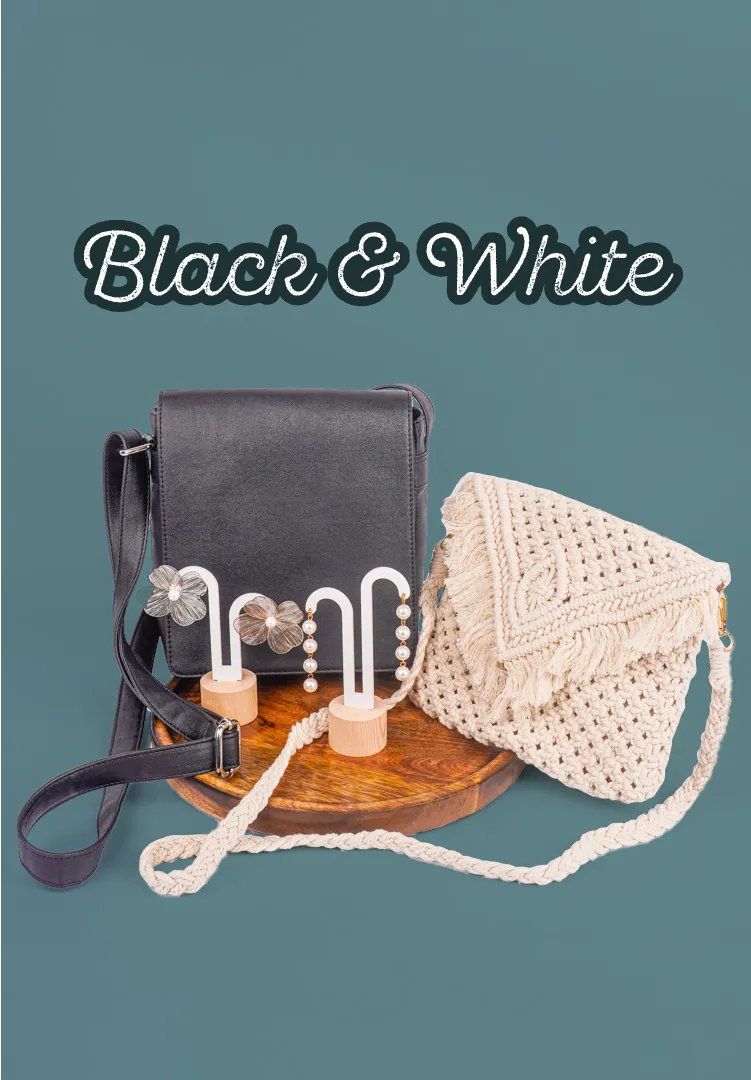 Timeless Black n White from Discoν. Α collection of two bags for all types of occasion, black and white along with two pairs of earrings.