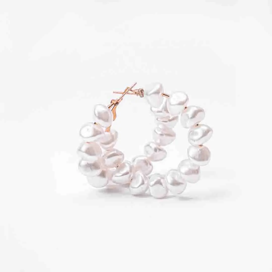 Metal hoop with golden tone/pearl white finish adorned with a series of evenly spaced white Boroque pearls and a hinged back