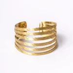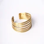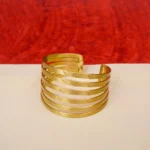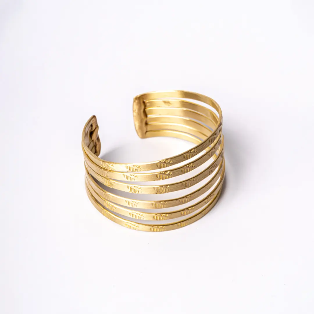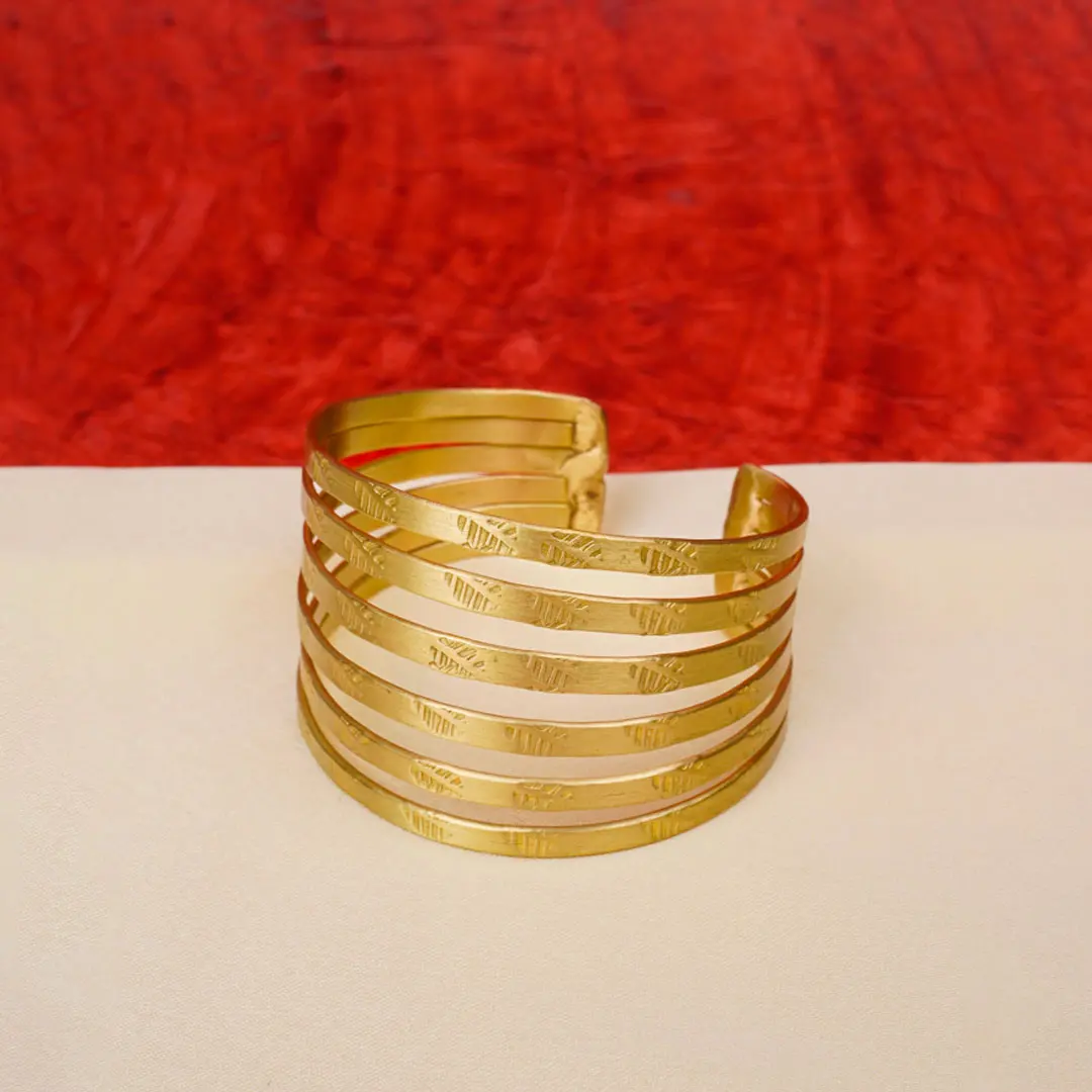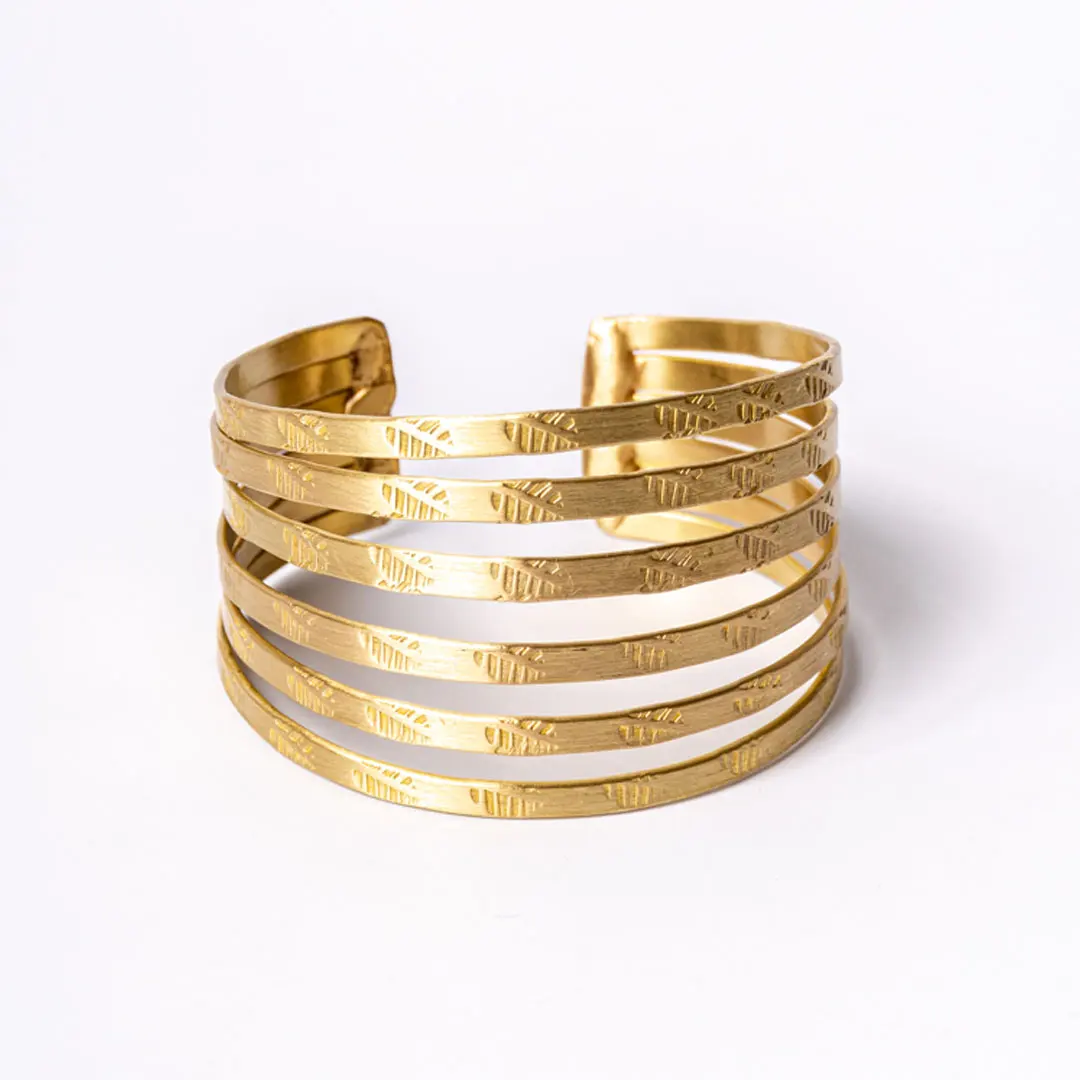 Metal cuff bracelet featuring multiple parallel bands adorned with subtle engraved leafy patterns with polished gold-tone finish