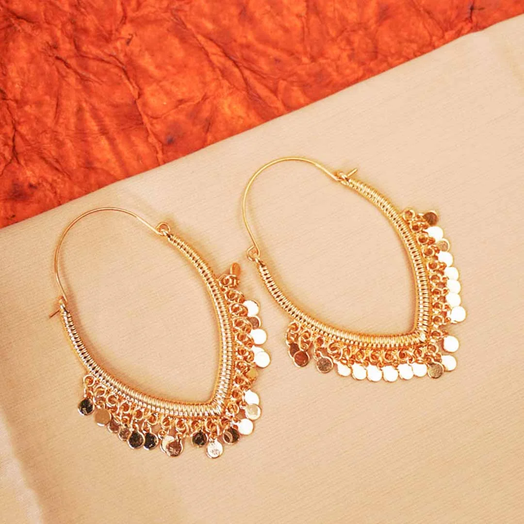 Inverted v shaped textured metal drop earring with antique gold-tone finish adorned with dangling small circular discs and a hinged back
