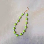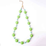 Beaded necklace with golden tone/leaf green,turquoise finish featuring round Shaped green coloured beads with symmetrically placed golden and sky-blue coloured beads with lobster claw clasp