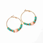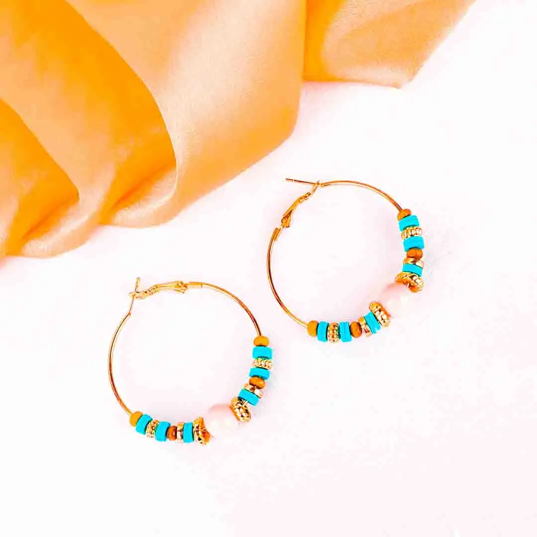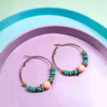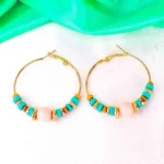 Metal hoop earring with golden tone/turquoise, light pink finish featuring turquoise gold and wooden beads along with a soft pink coloured bead in the centre and a hinged back