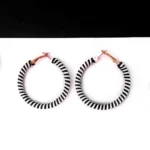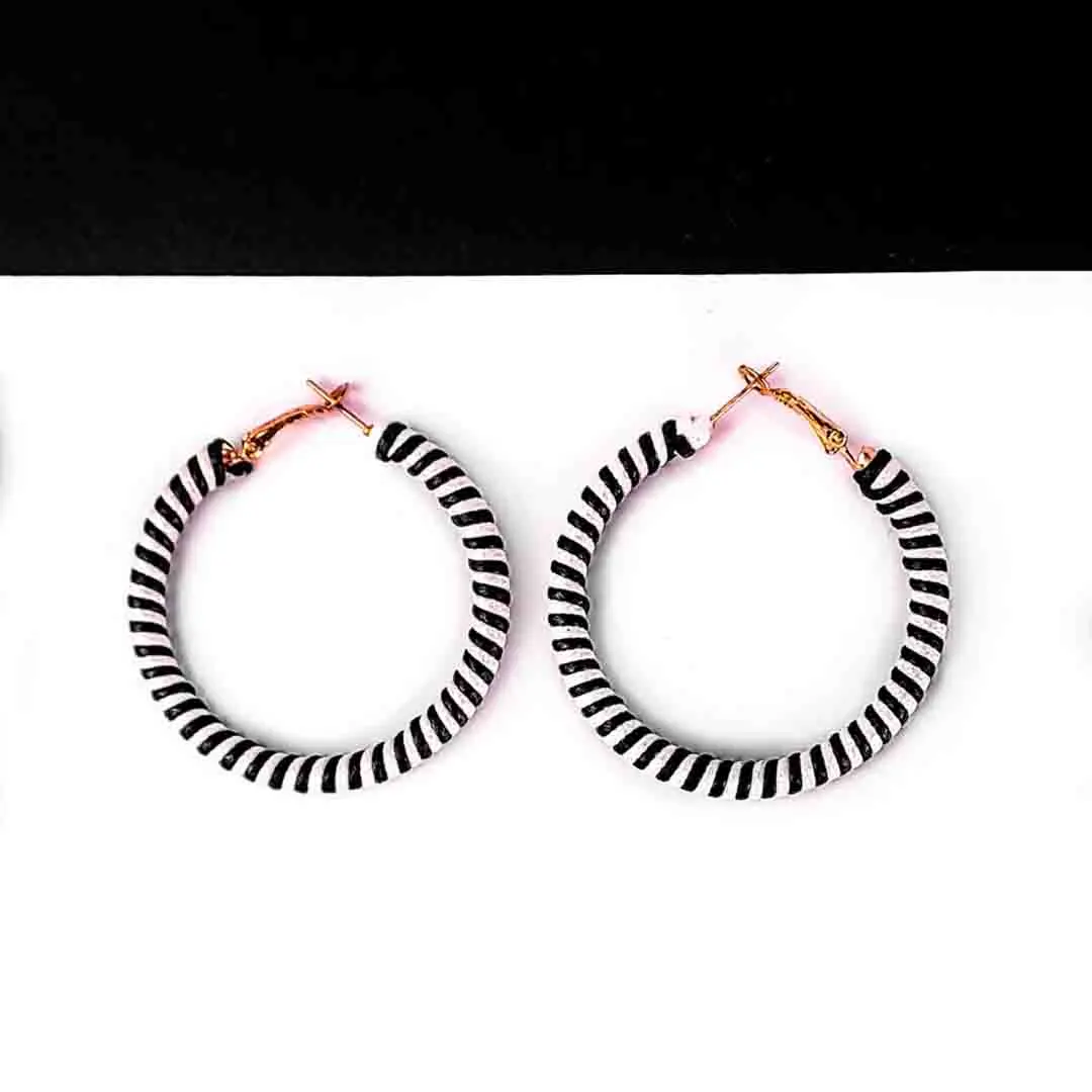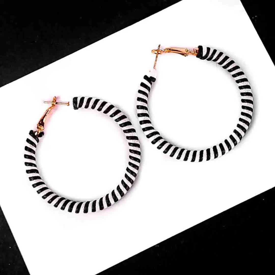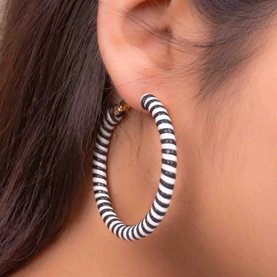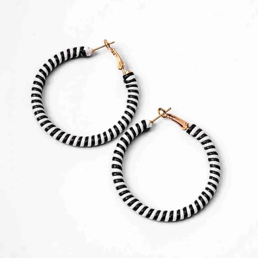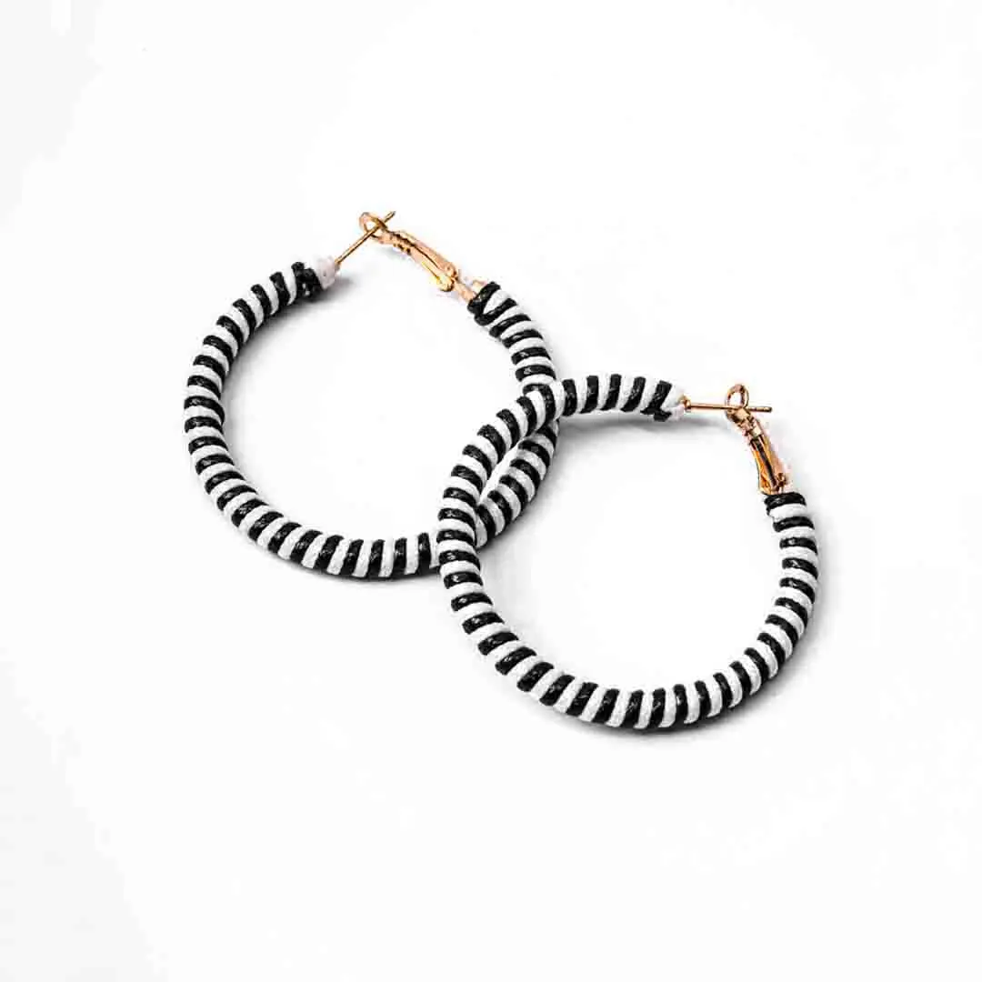 Metal hoop earring wrapped with black and white stripped patterned thread and a golden hinged back