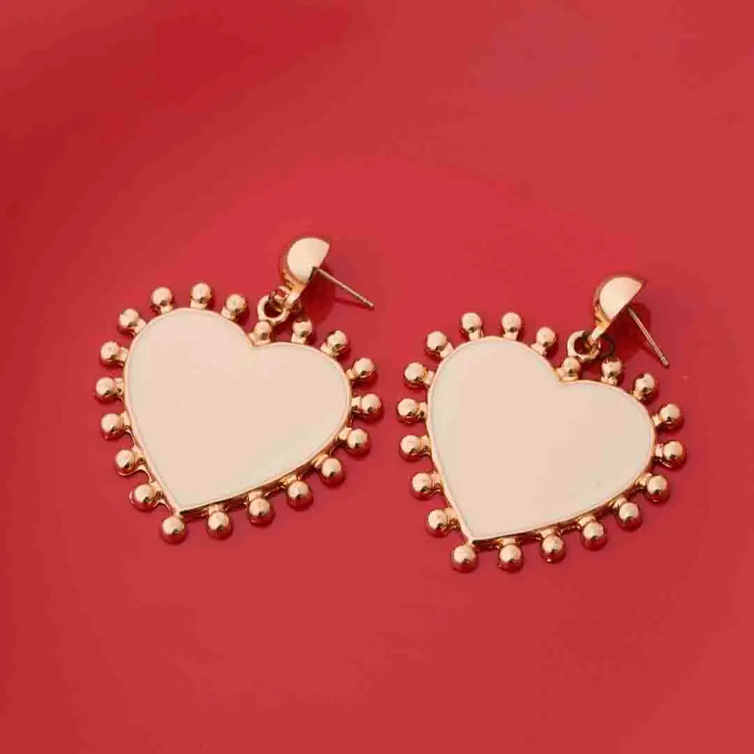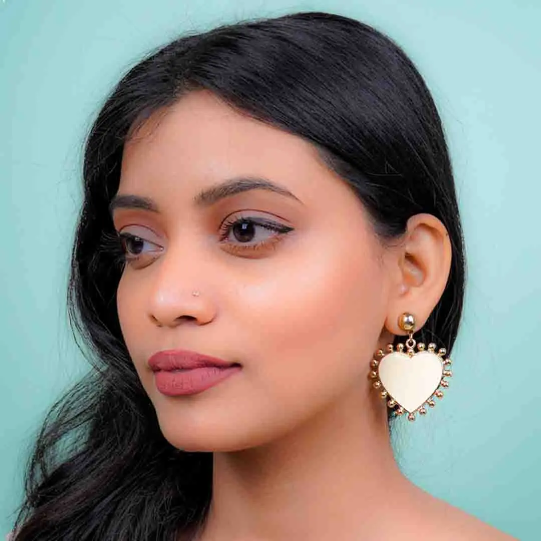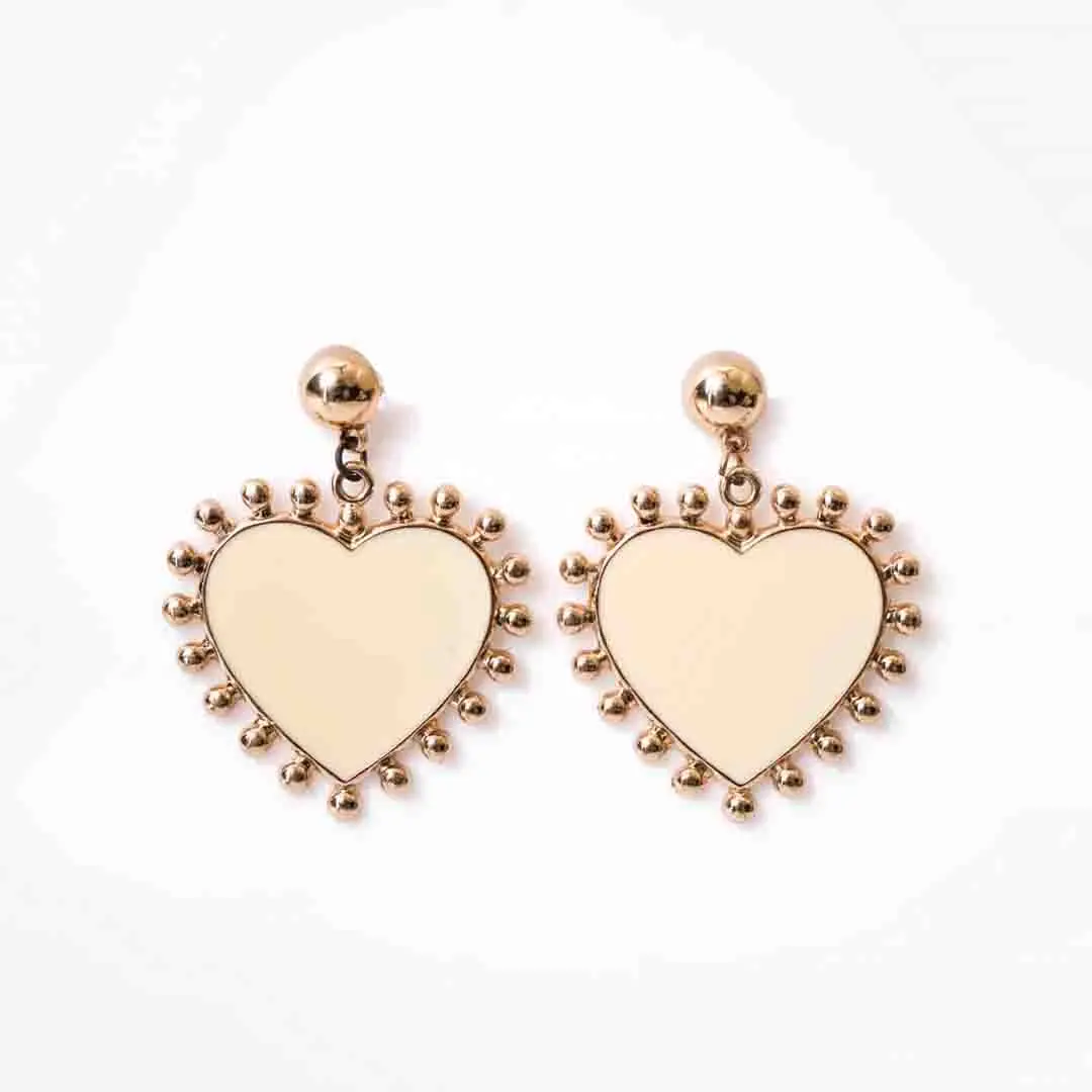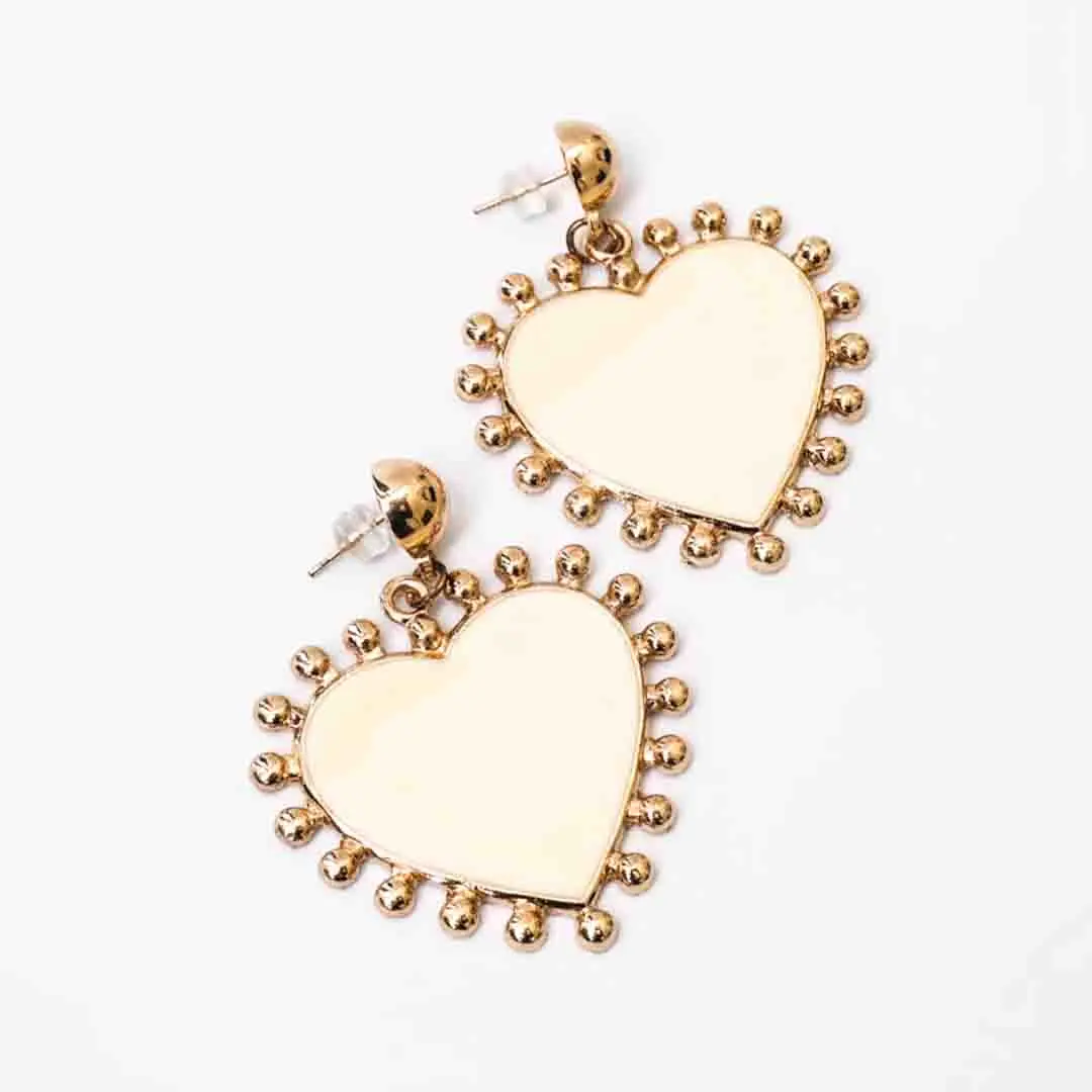 Heart shaped dangle earring with solid cream colour inlay framed with small evenly shaped gold beads and push back post