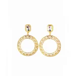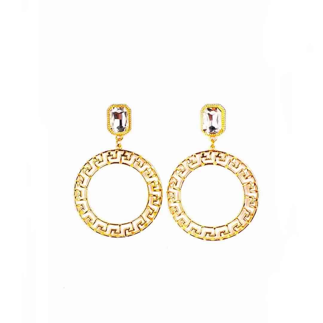 Statement geometric drop earrings featuring a rectangular faceted crystal stud with a textured gold-tone border and an open circular hoop showcasing a sleek key pattern. Crafted in polished alloy with a push-back post closure.