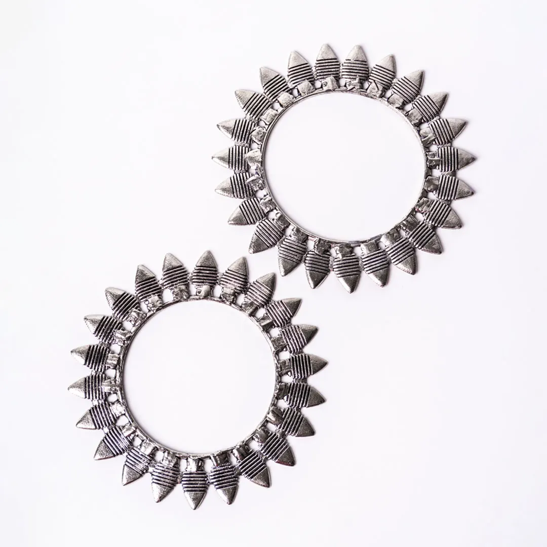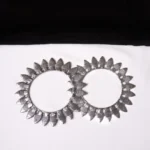 Set of bangles with fine line detailing and oxidised silver tone finish featuring a series of triangular shaped cone structured designs