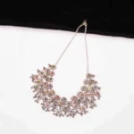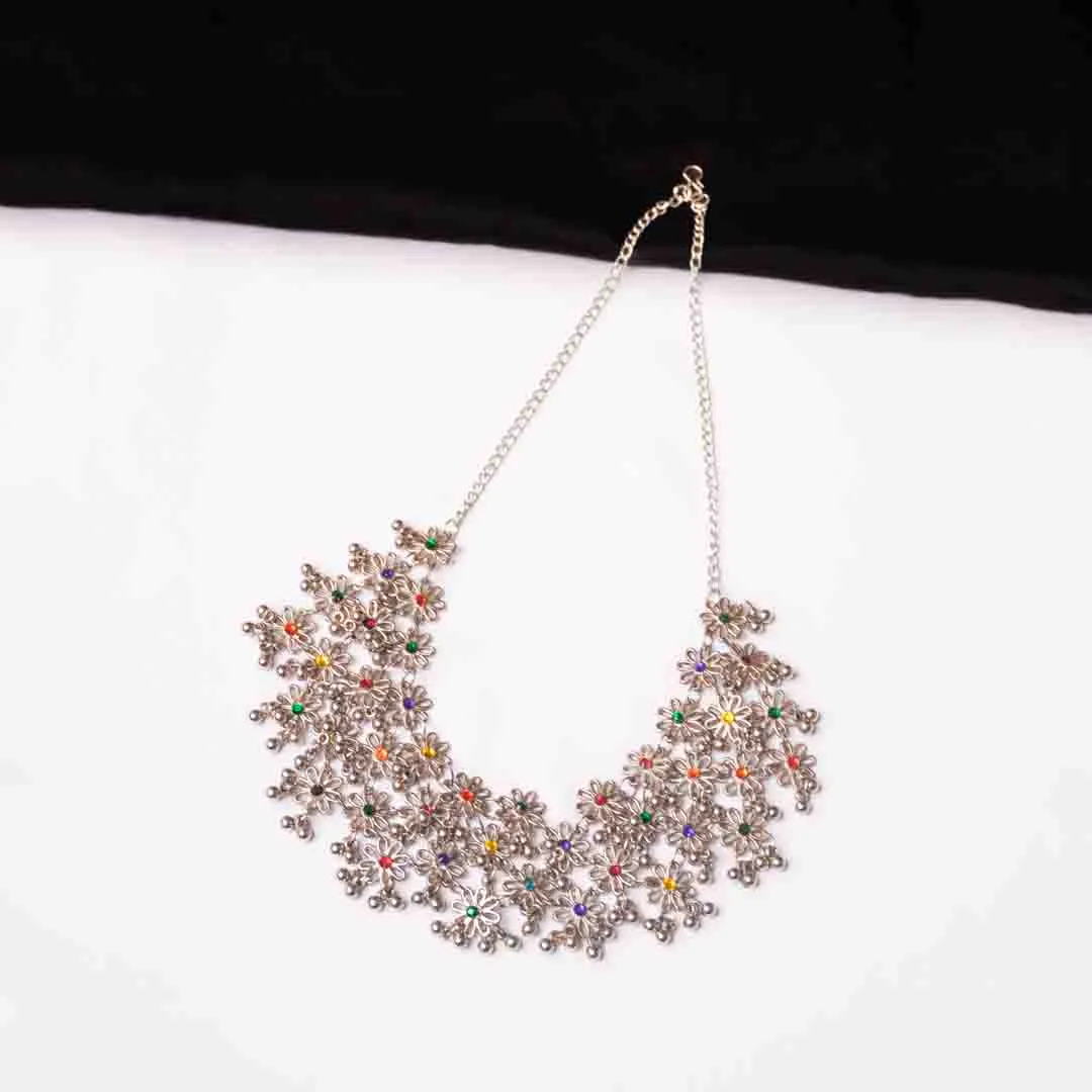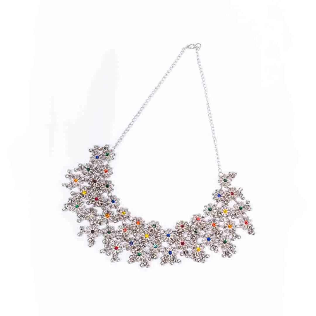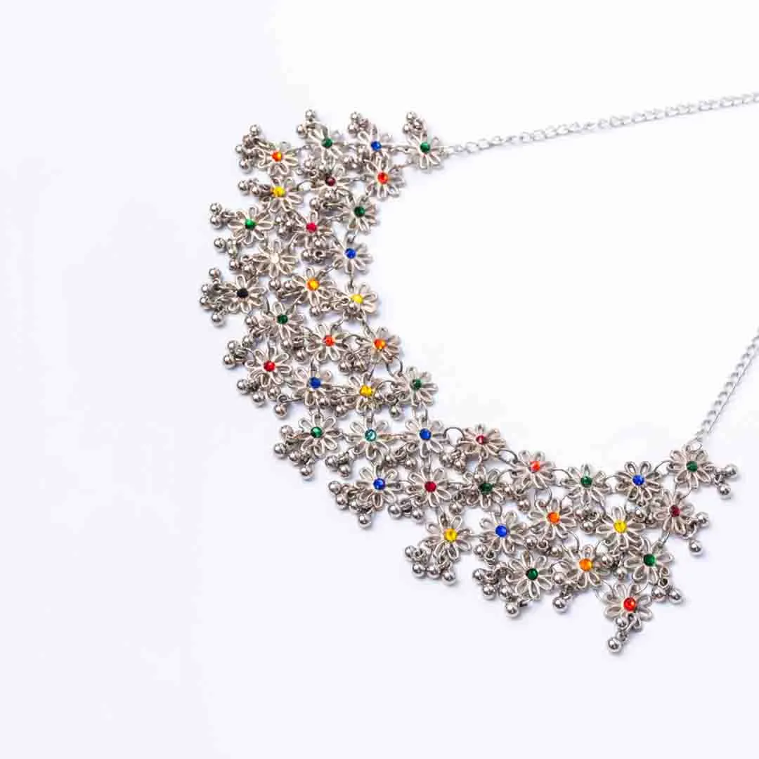 Metal curb chain necklace featuring a series of interconnected small flower shaped designs adorned with colourful gemstones and ghungroos and a s hook closure