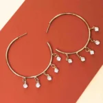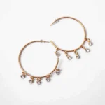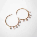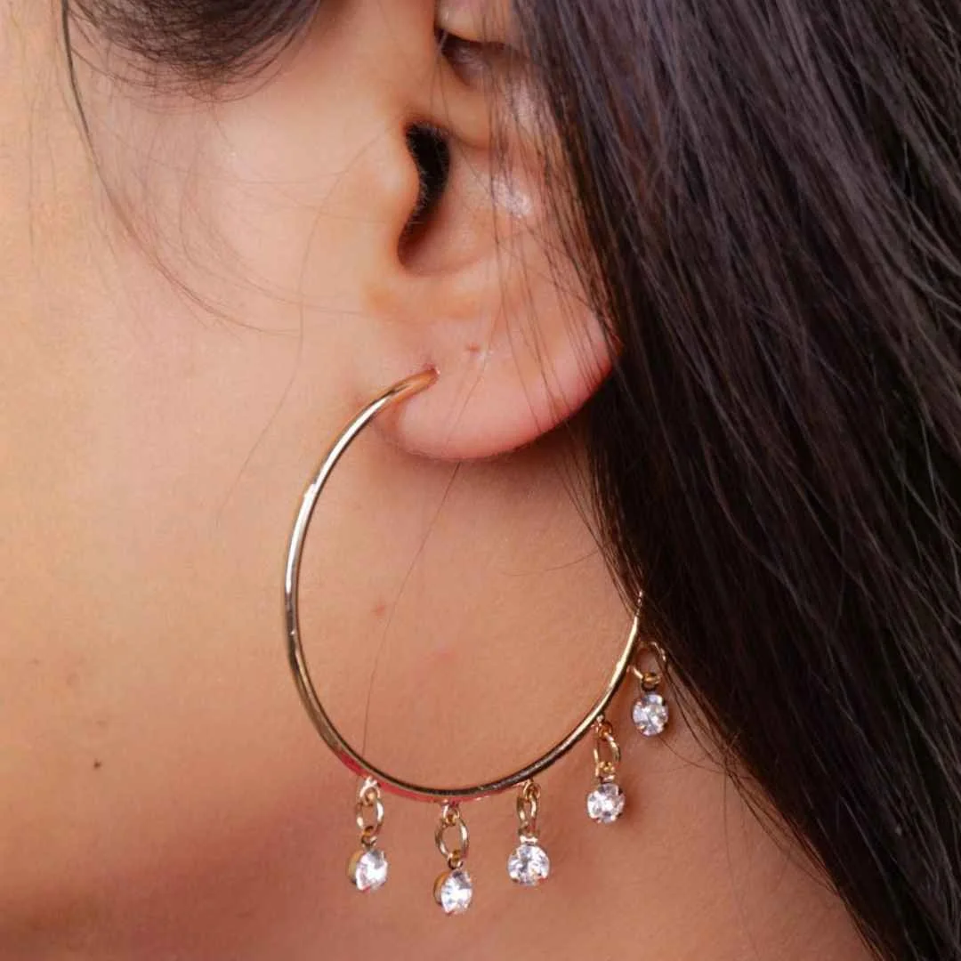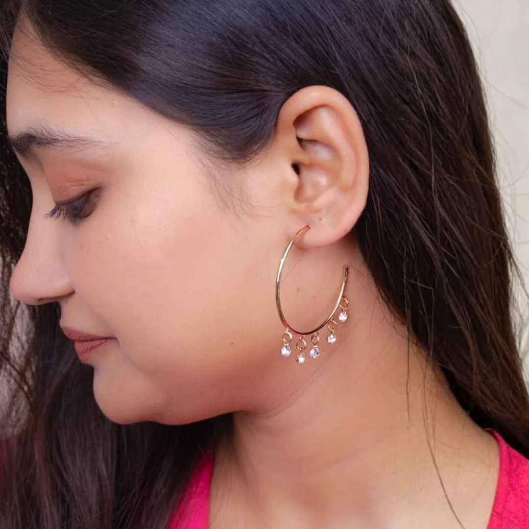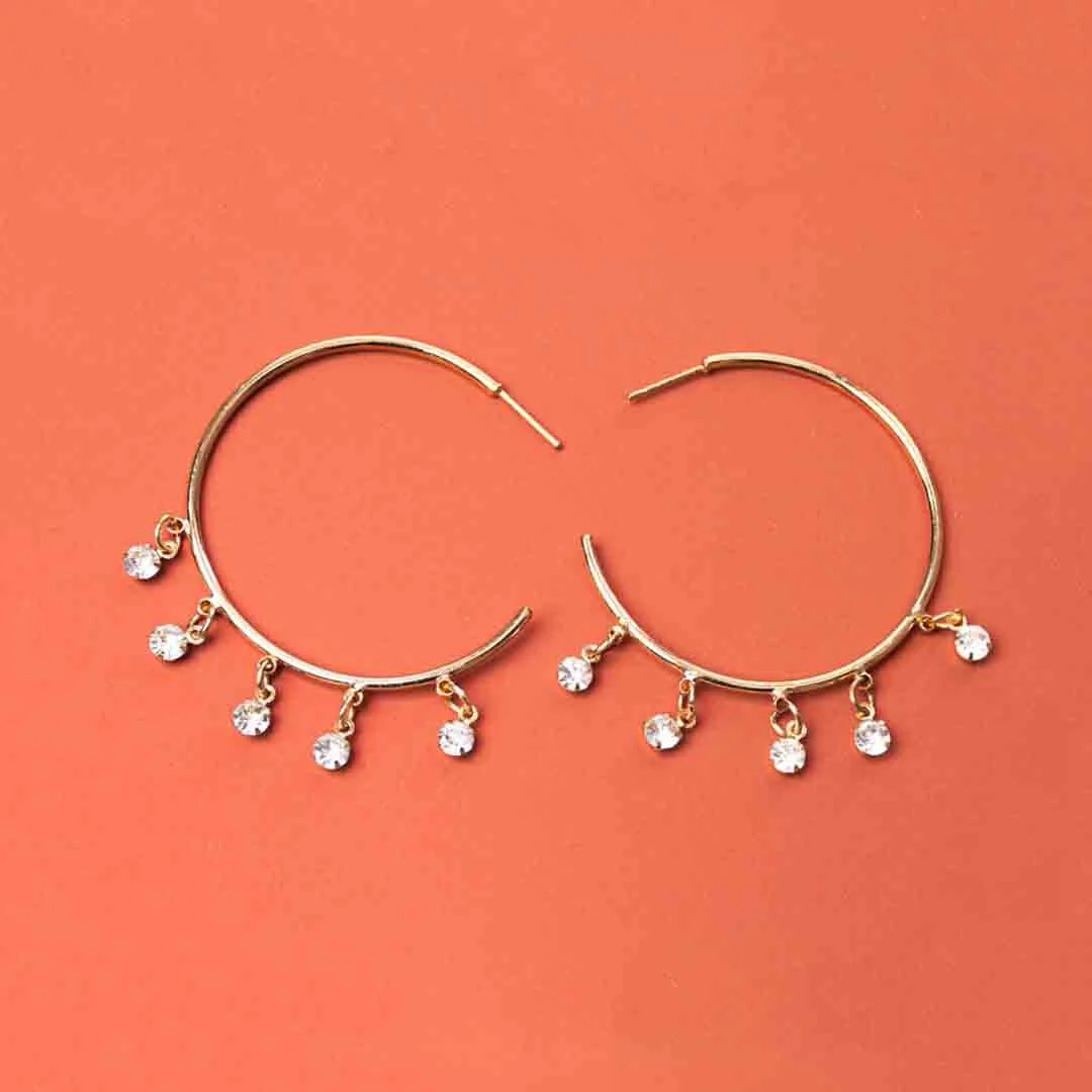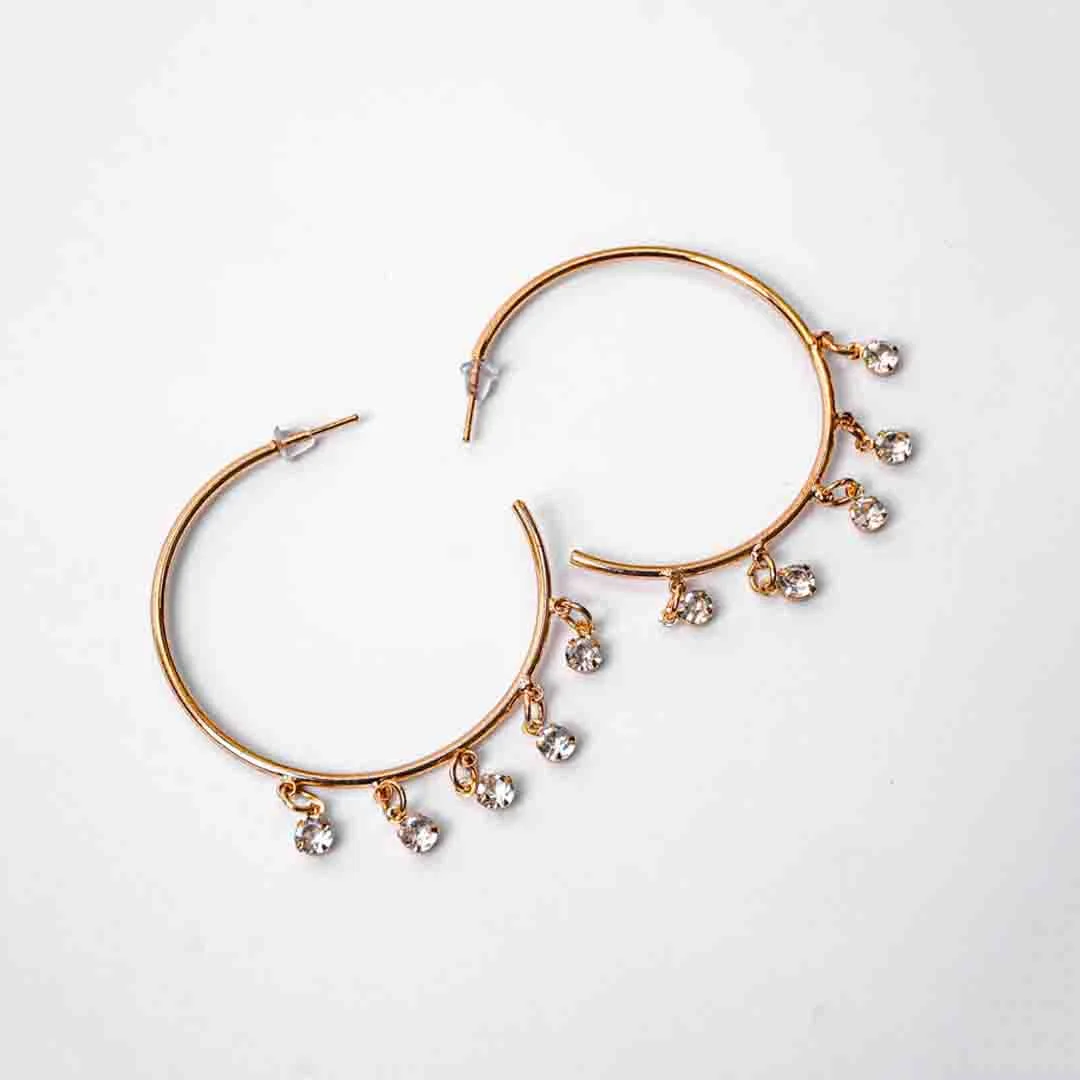 Open circular metal hoop with golden tone finish adorned with dangling clear gemstones and push back closure