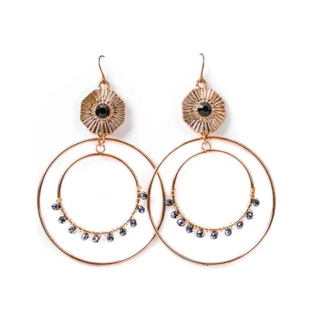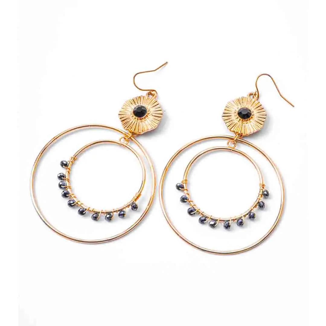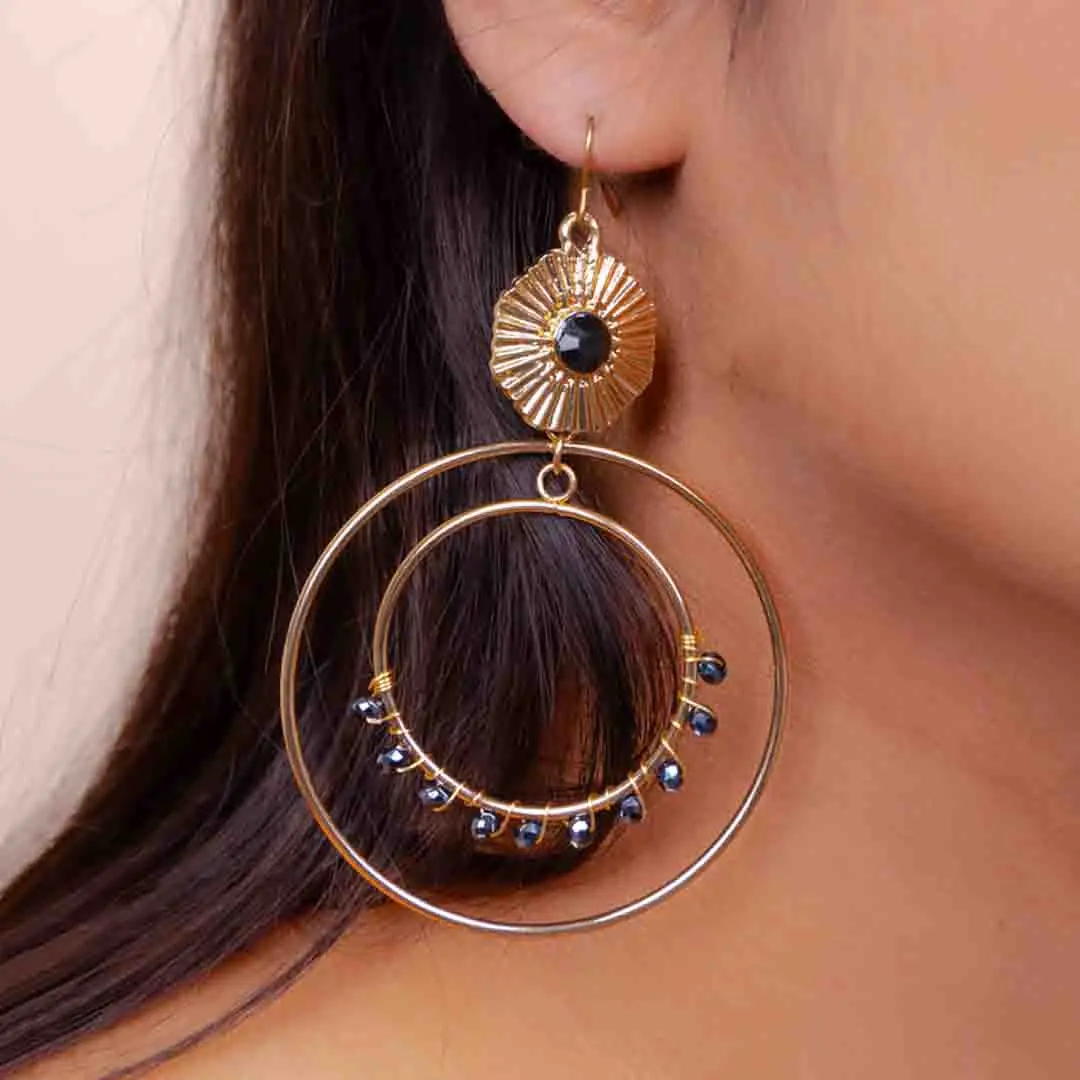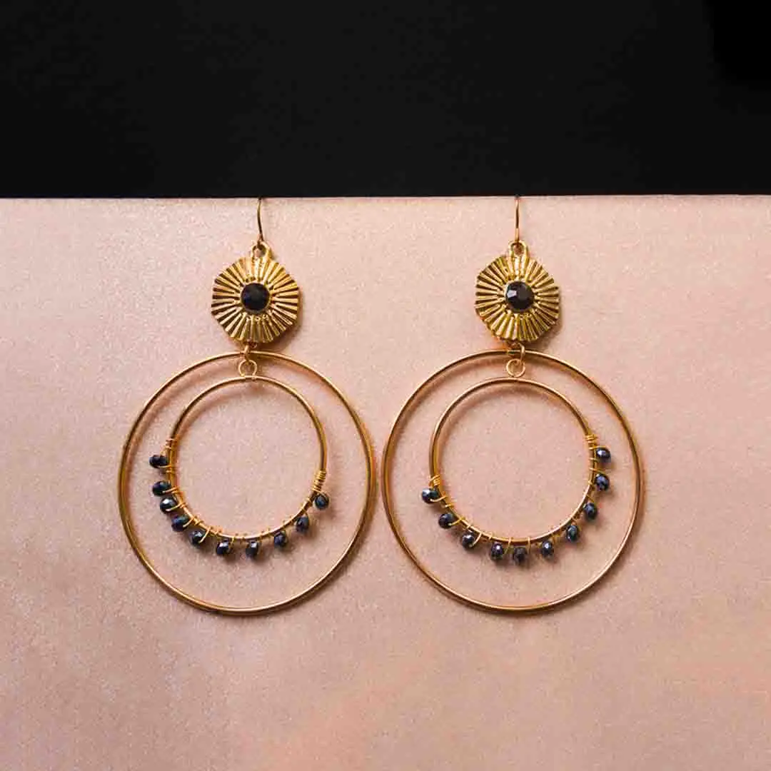 Metal hoop earring with gold tone finish embellished by a dangling small hoop adorned by small black shiny polished beeds and textured octagon shaped golden top with a shiny black gemstone in the center and fish hook closure
