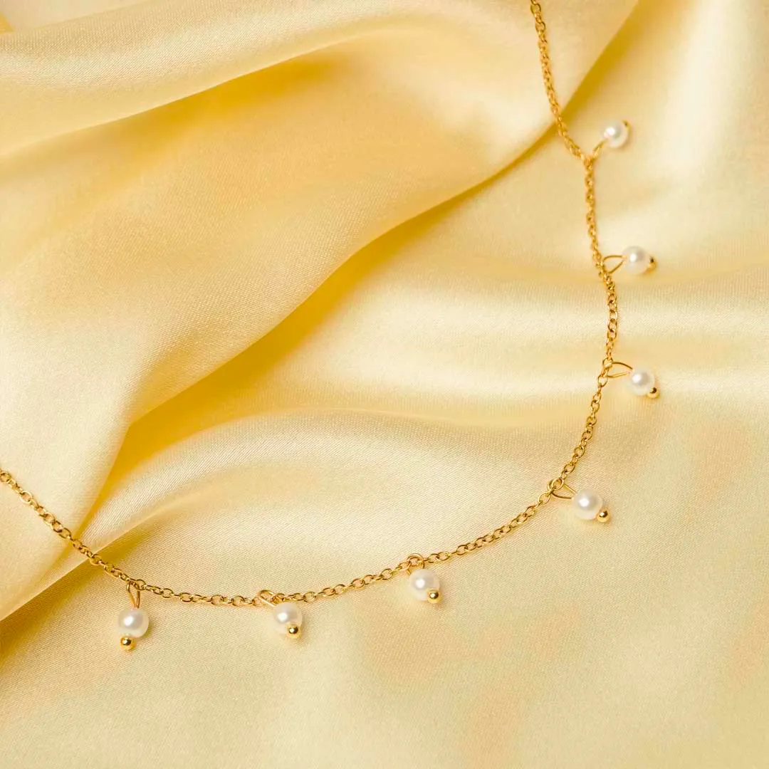 Delicate curb chain necklace with gold-tone finish featuring a series of dangling mini pearl beads and a lobster claw clasp