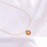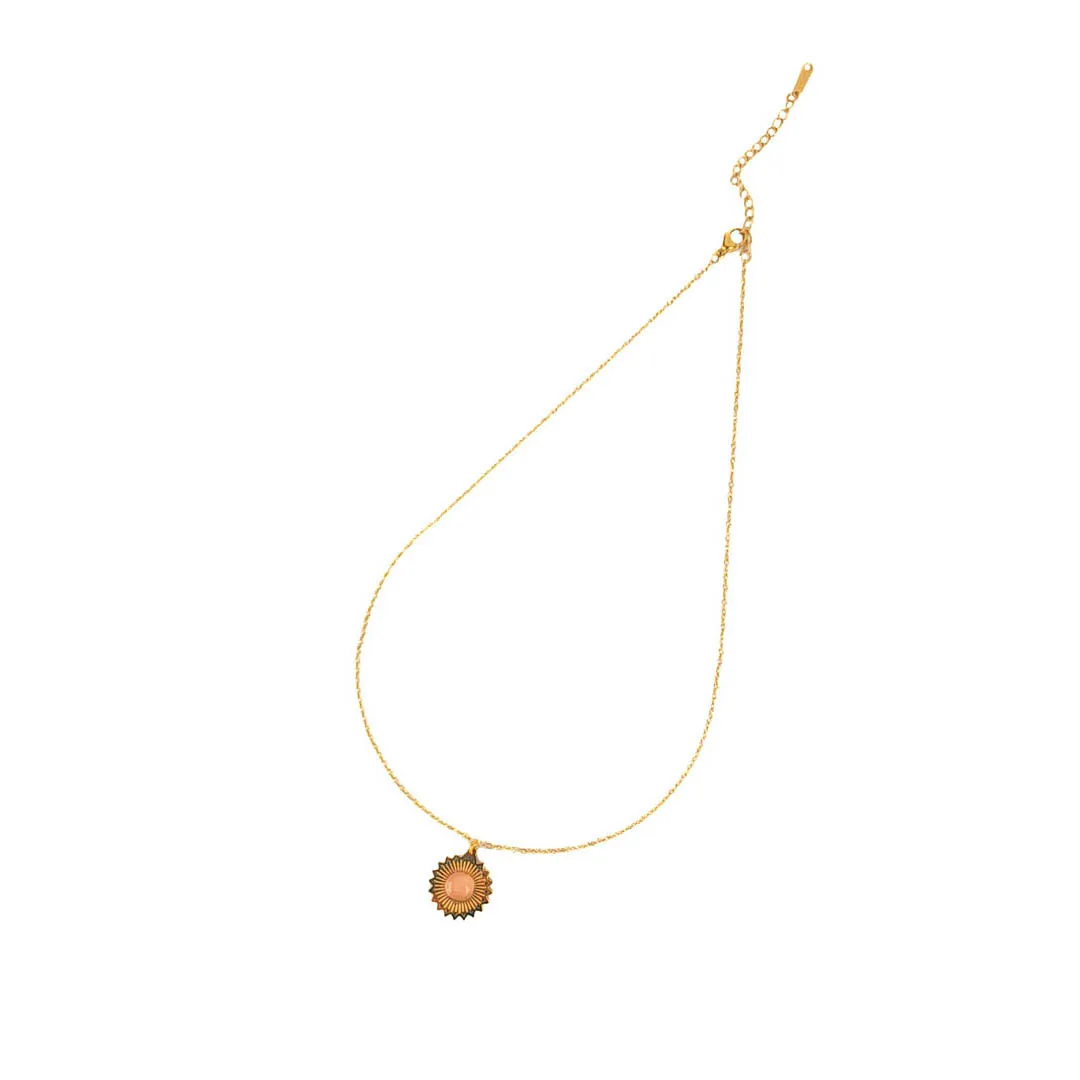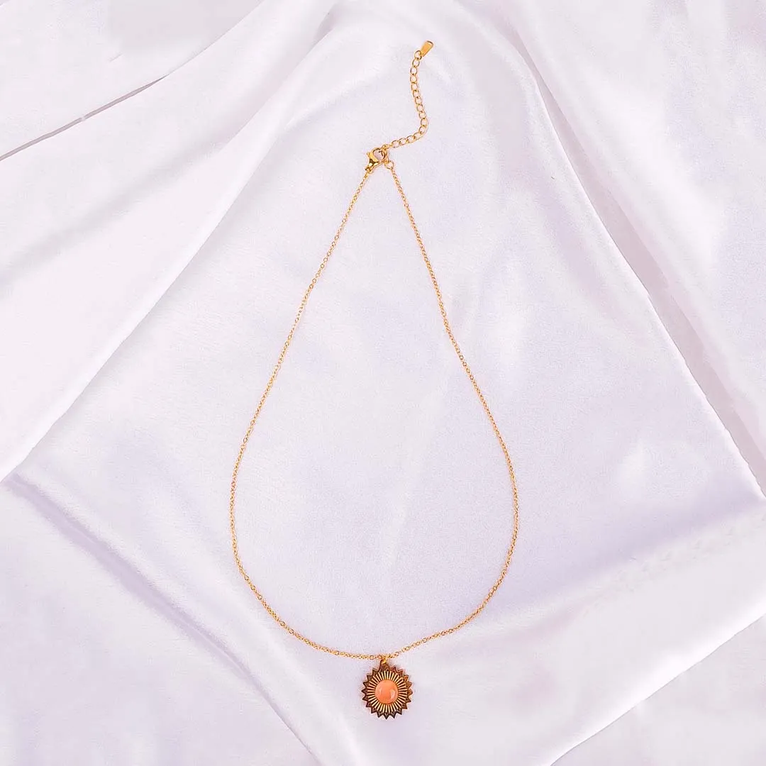 Stainless steel necklace featuring a radiant sun-shaped pendant with gold-toned rays and a polished pink center. Delicate chain with a secure clasp, blending celestial charm with modern elegance.
