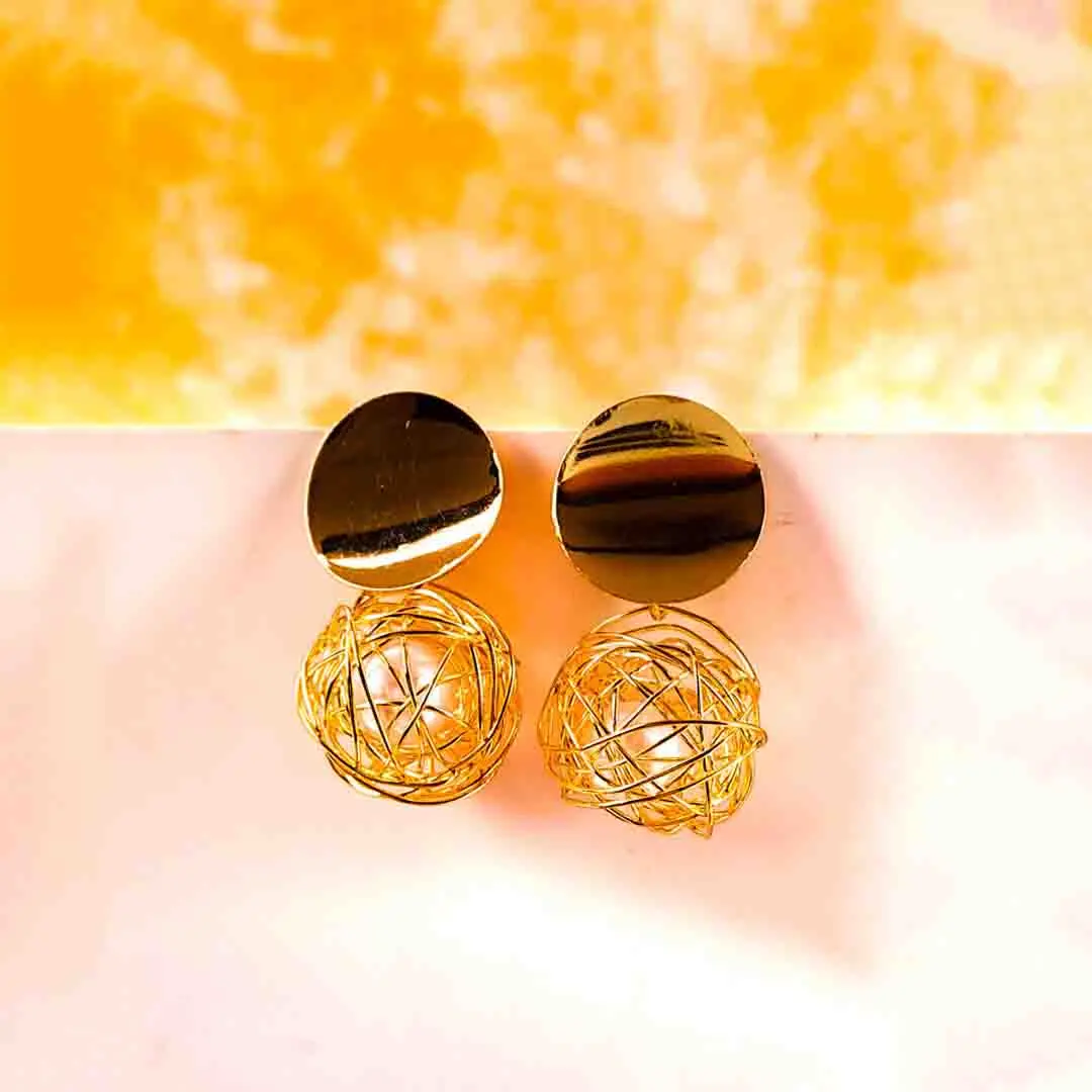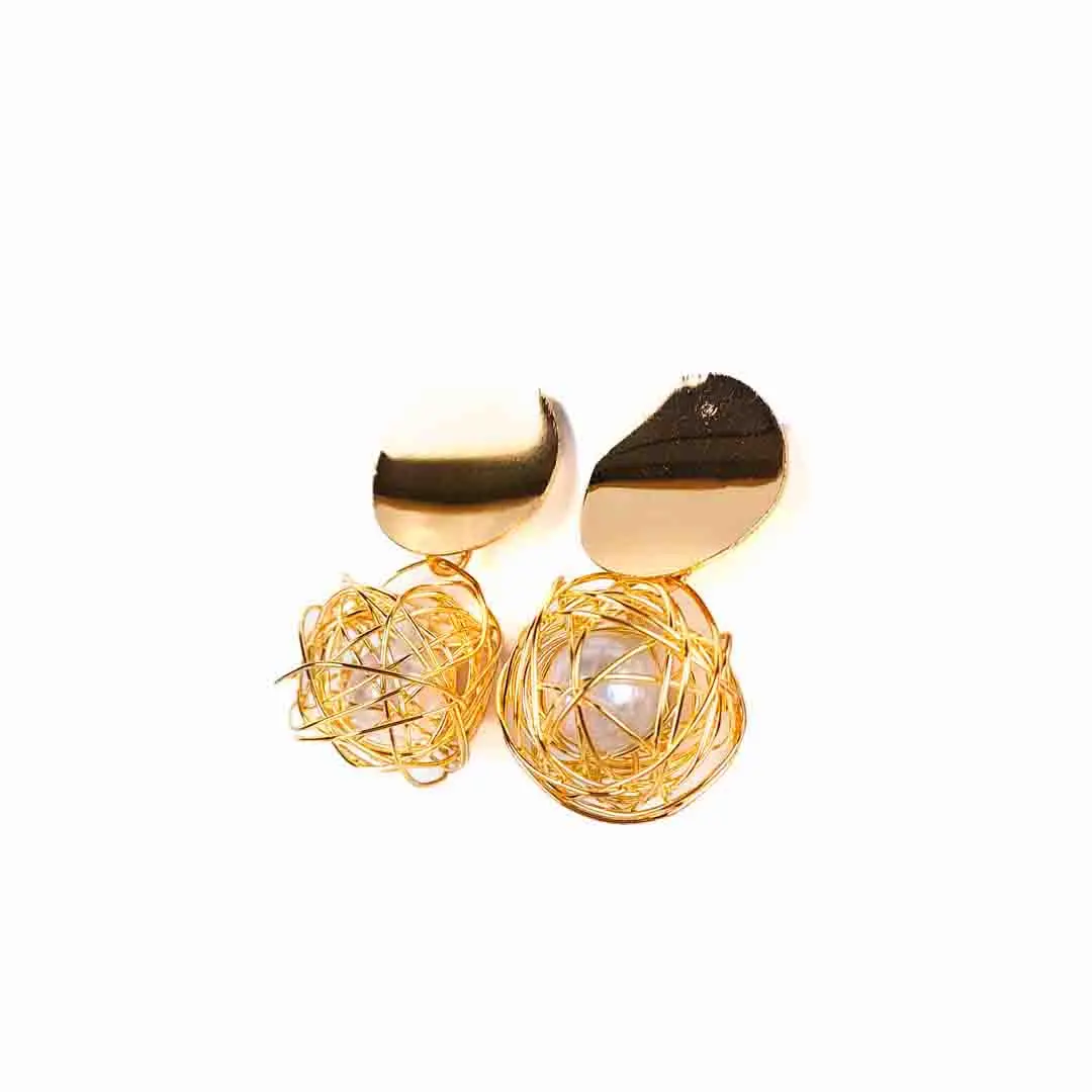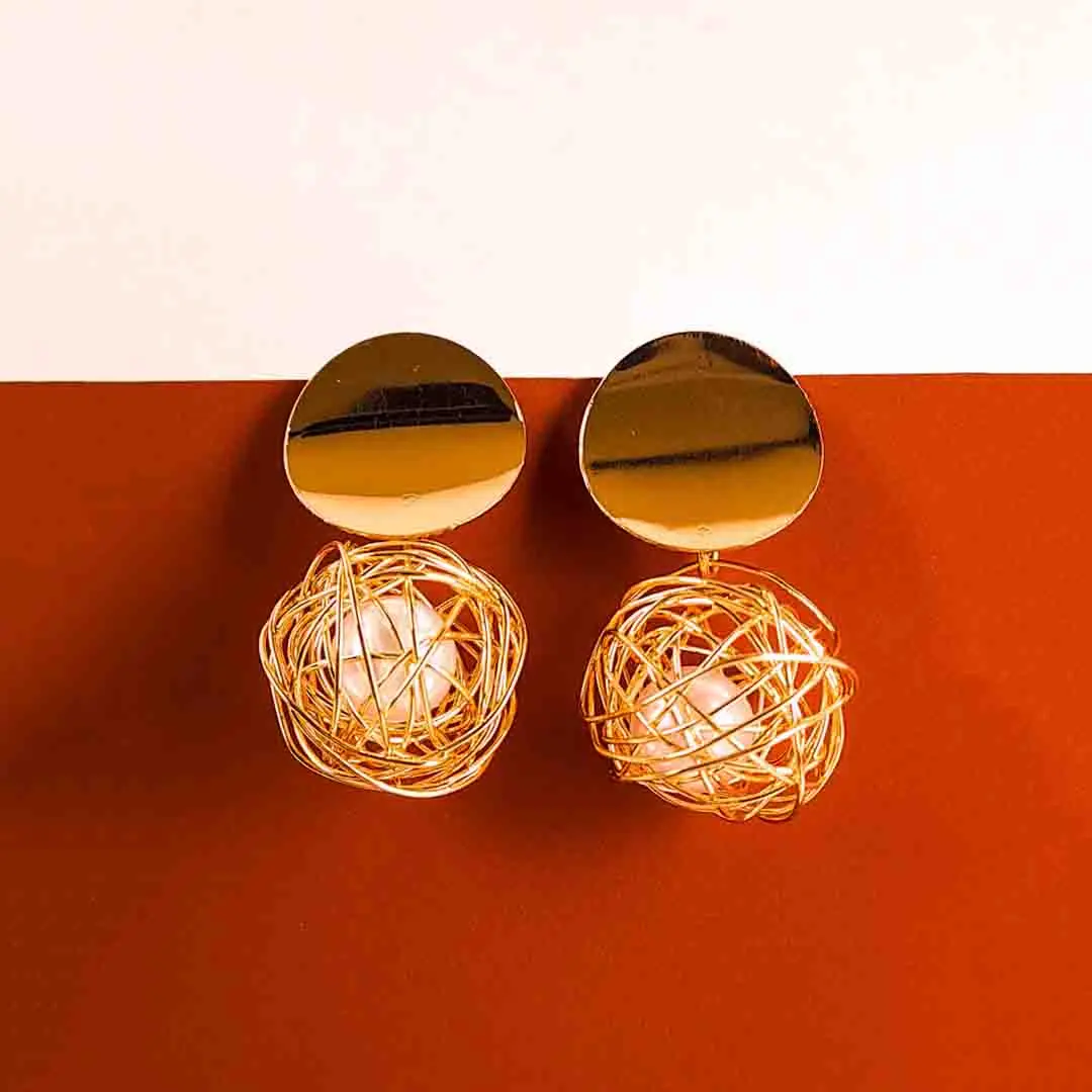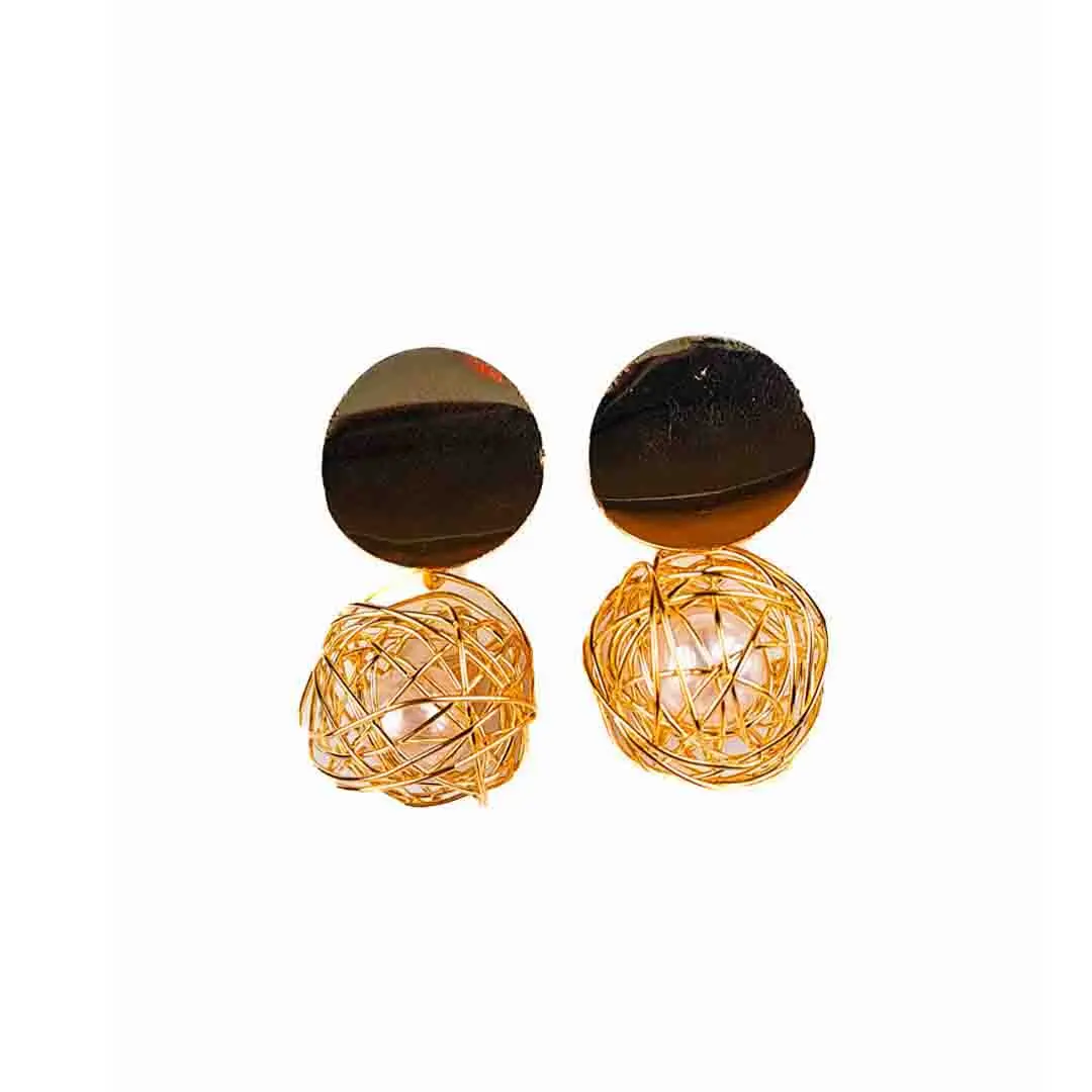 Modern drop earrings featuring hand-crafted metallic wire globes encasing faux pearls, anchored by smooth disc studs and secured with classic post closures, offering a fresh minimalist statement.