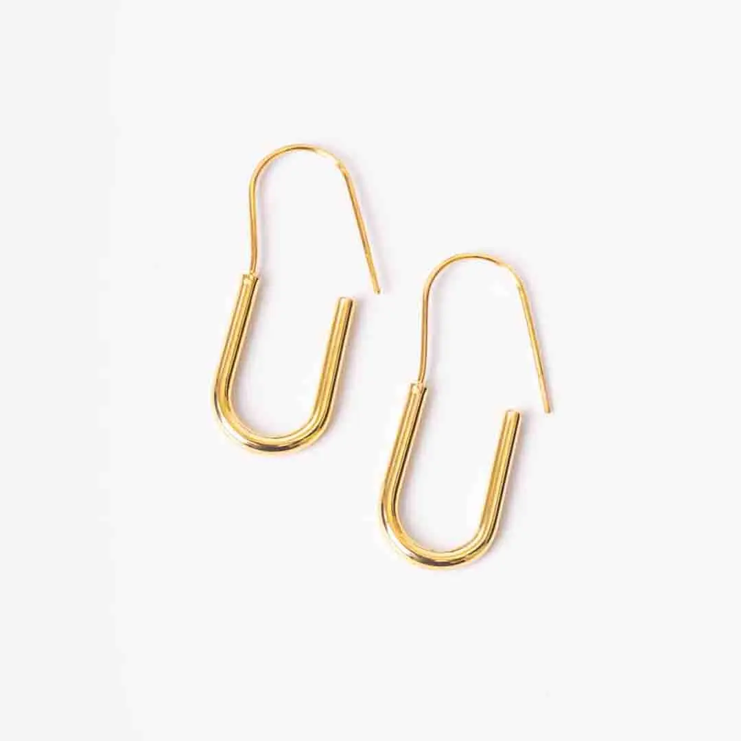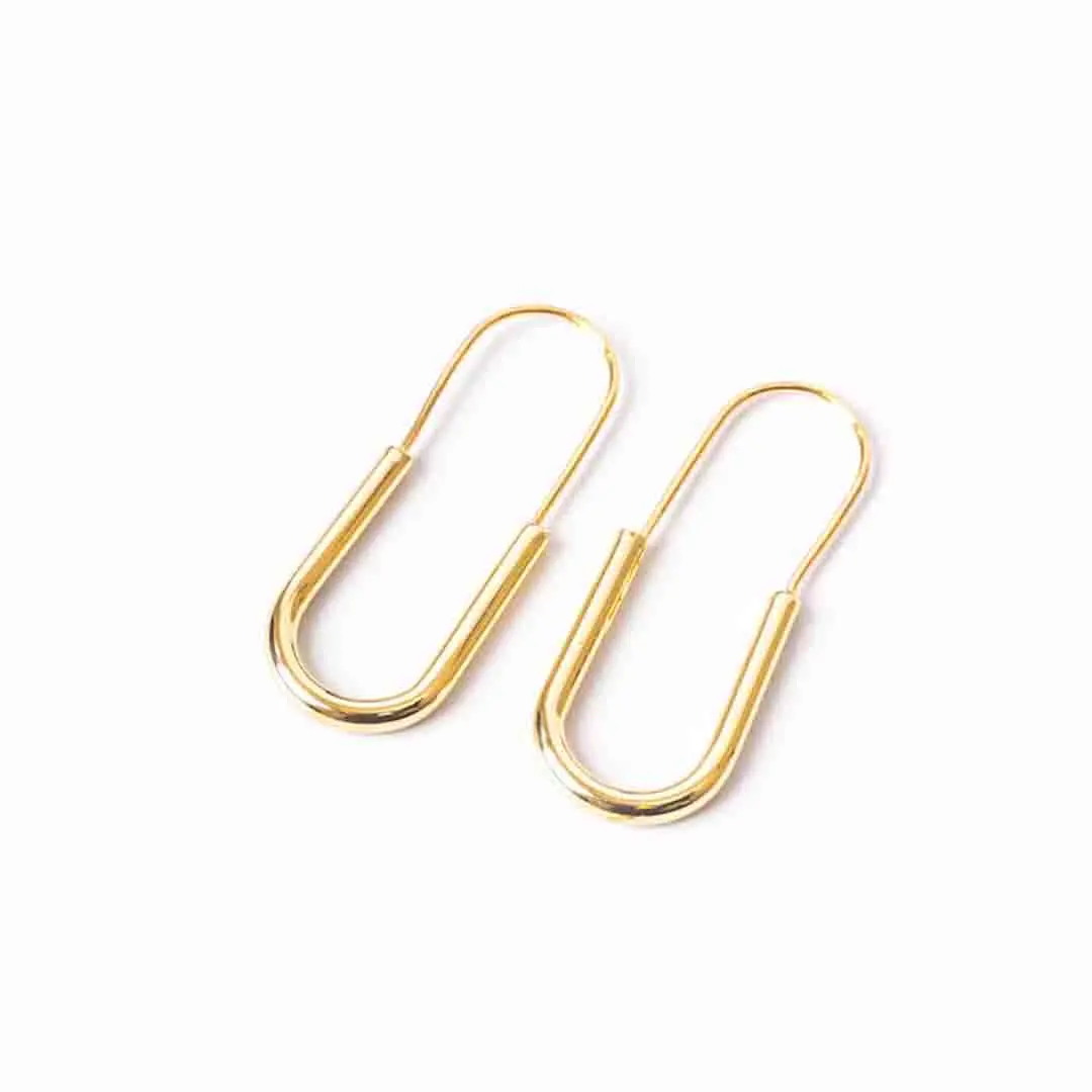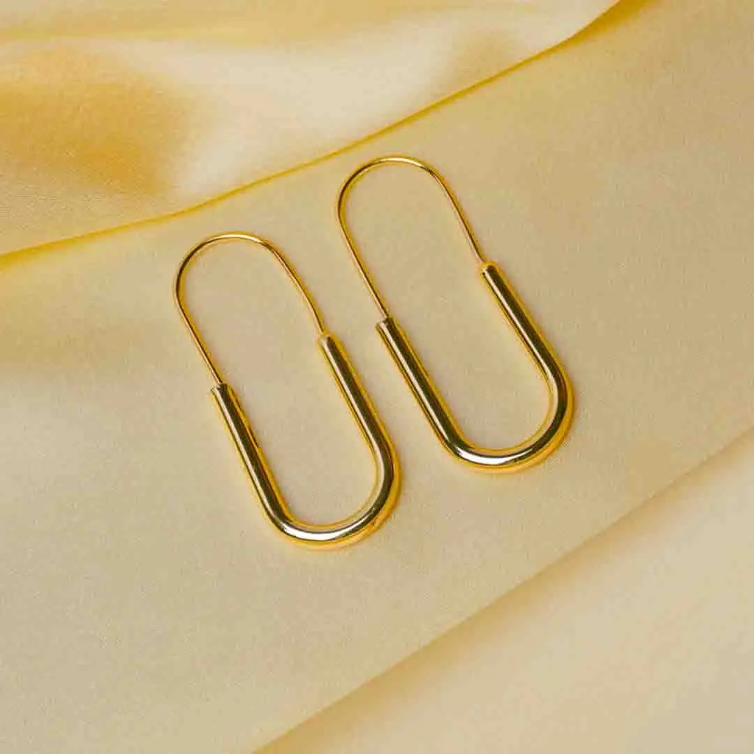 Elongated oval shaped pin structured metal hoop earring with polished gold-tone finish and a lever back