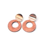 Circular wooden drop earring with a cutout center Partially overlaid by a small slightly tilted golden disc and push back closure