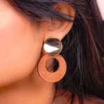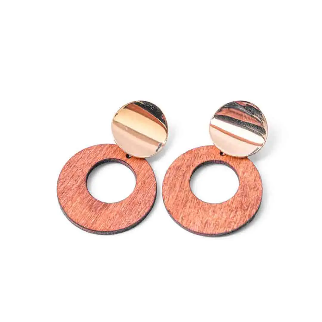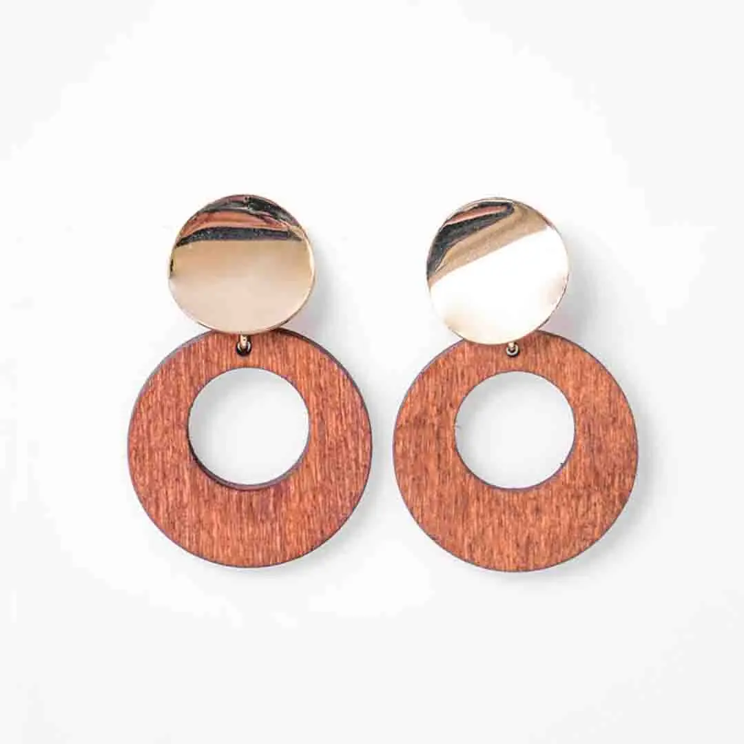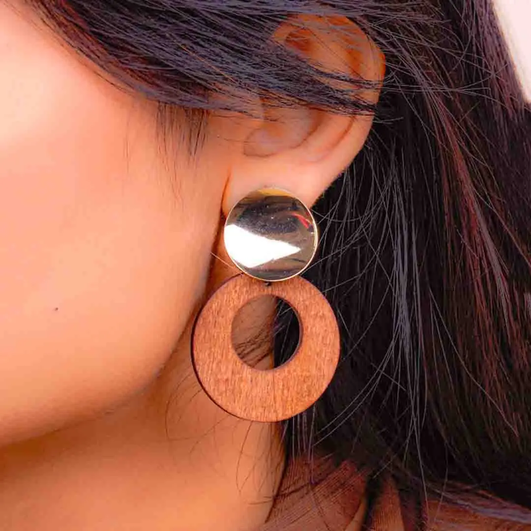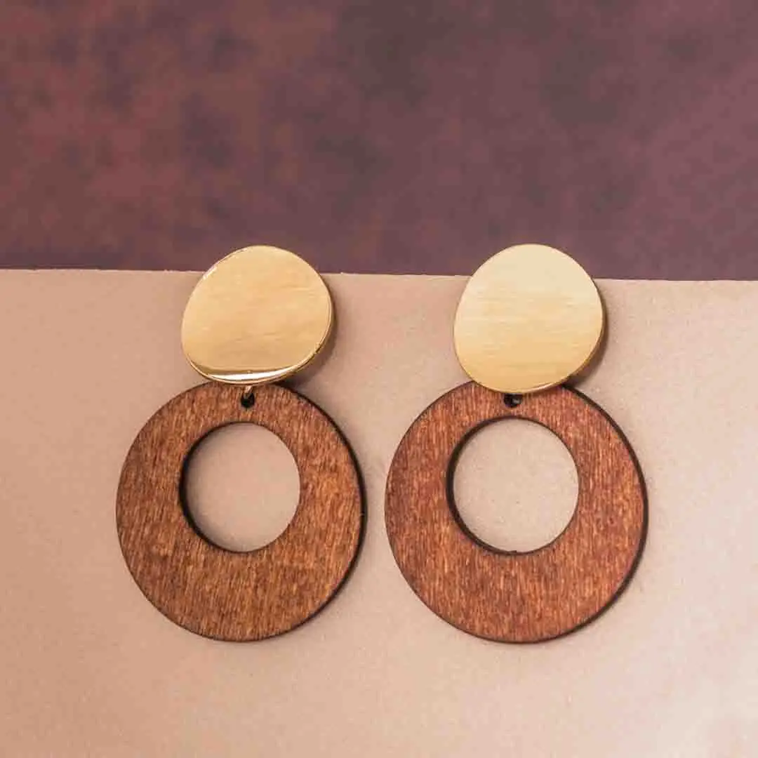 Golden Top Wooden Circular Drop Earrings