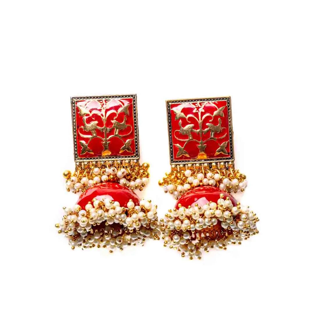 Jhumka earring with red colour and gold-tone finish featuring square shaped top with red coloured enamel inlay and fine meenakari detailing adorned with a series of small circular pearl beads at the edges and a push back closure