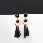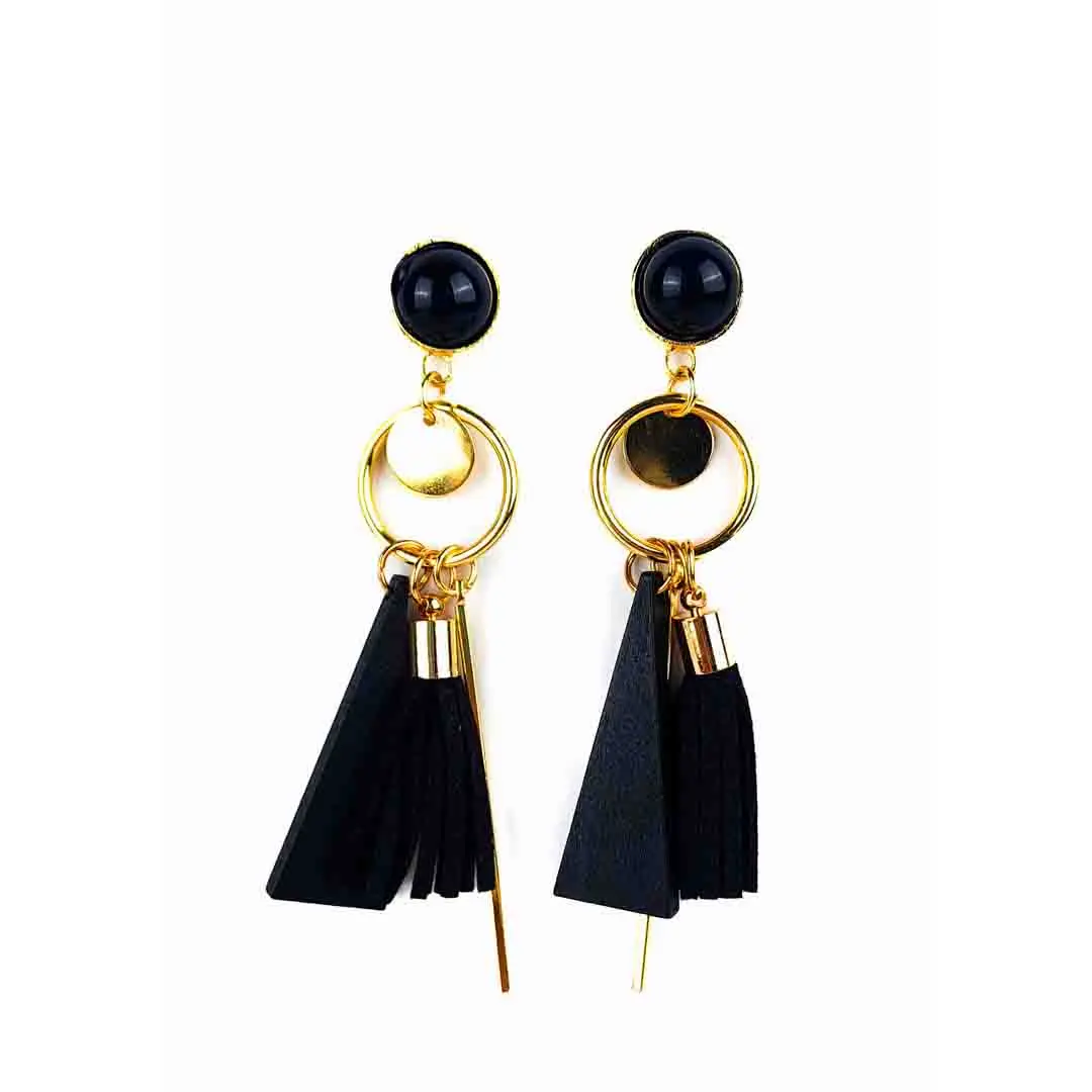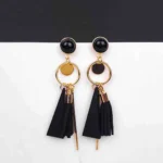 Chic dangle earrings composed of polished oval studs, geometric hoops, and tassel accents, featuring sleek metallic elements and a classic post closure for an effortlessly modern and bold statement accessory.