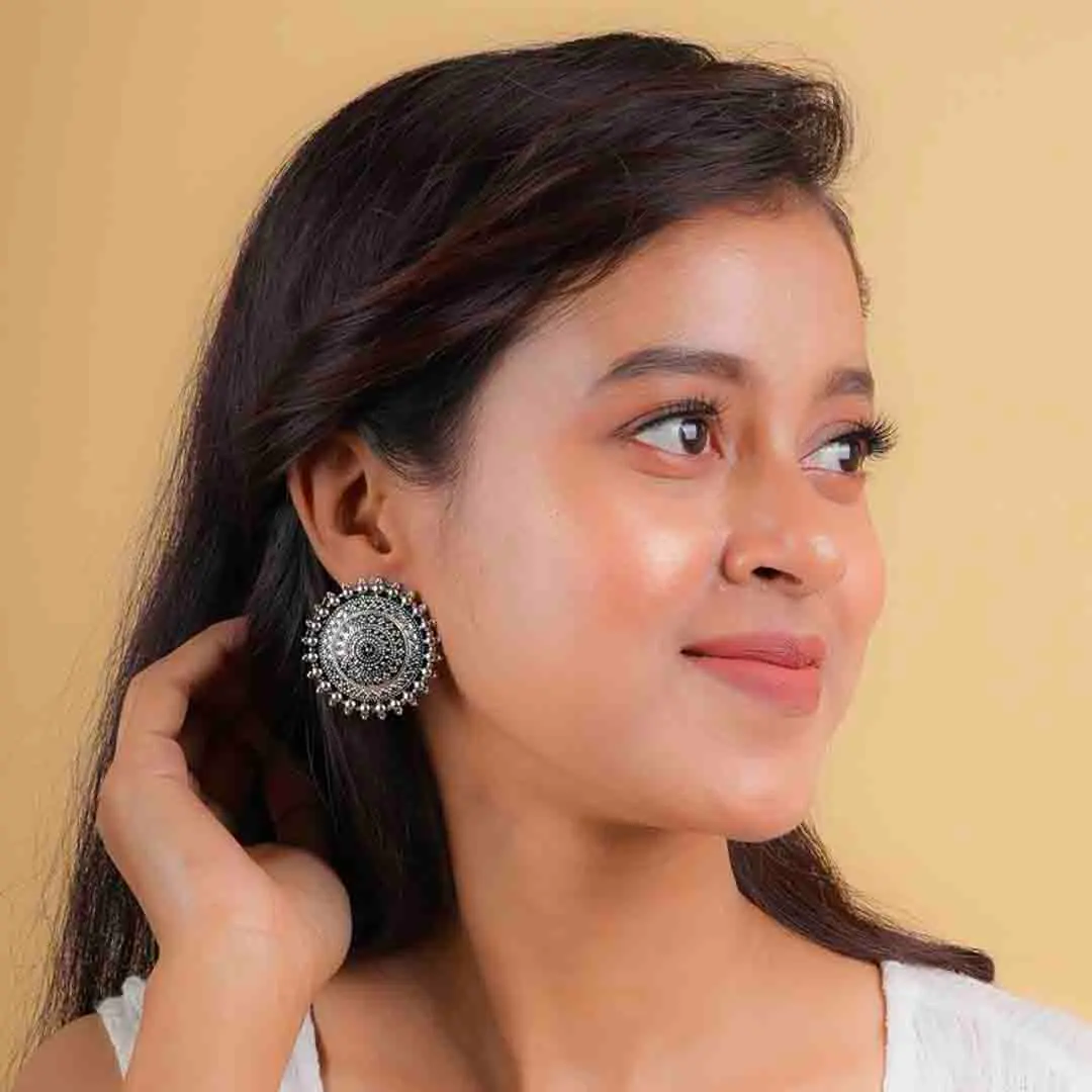 Large circular metal stud earring with oxidised silver tone finish featuring fine intricate design surrounded with evenly spaced circular beads and a push back closure
