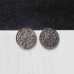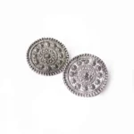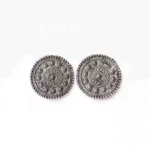 Large circular metal stud earring with oxidised silver tone finish featuring finenintricate floral design surrounded with small circular beads and a push back closure