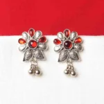 Floral designed metal stud earring with oxidised silver tone finish embellished with red coloured stones and two metallic beads at the bottom with a push back post