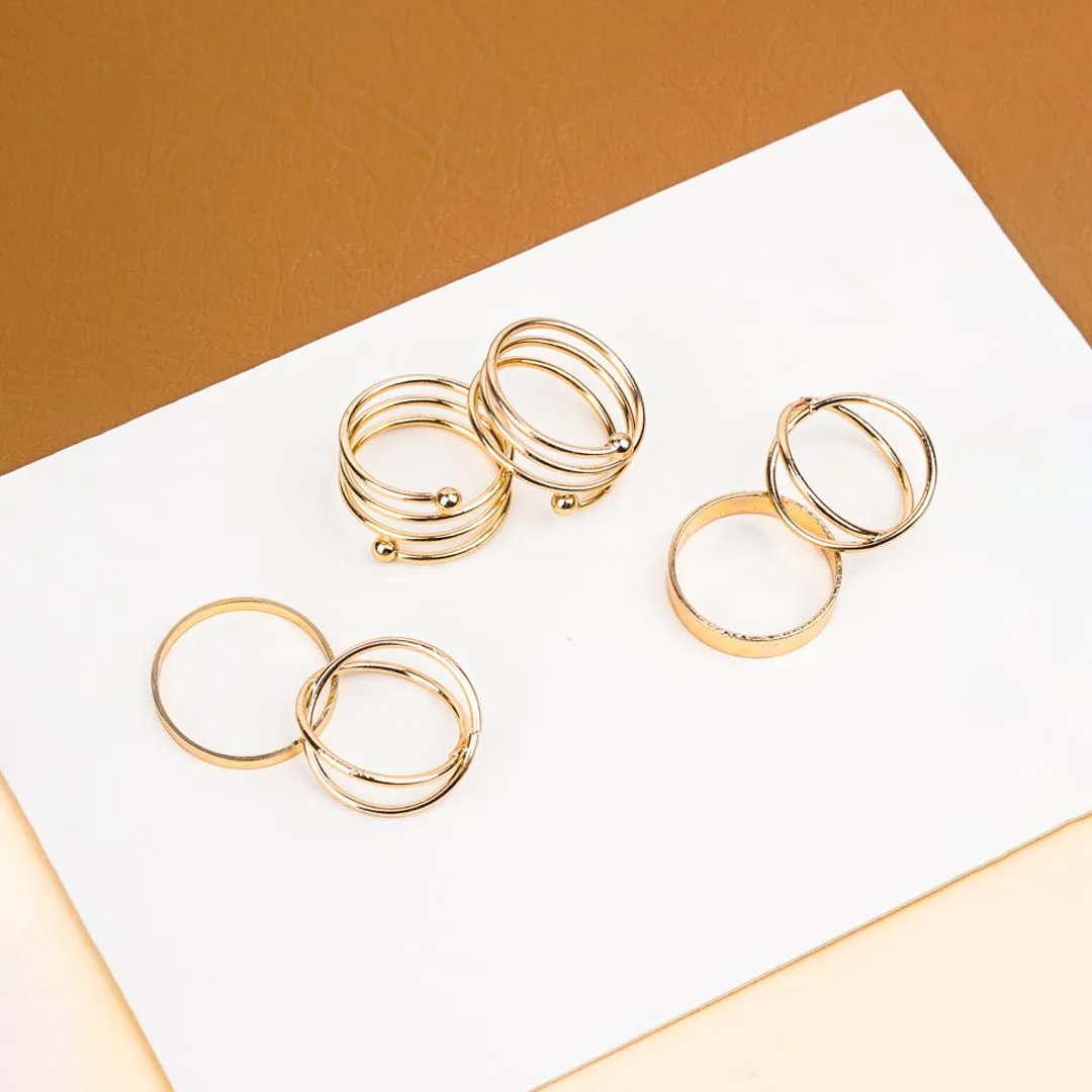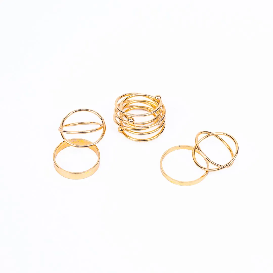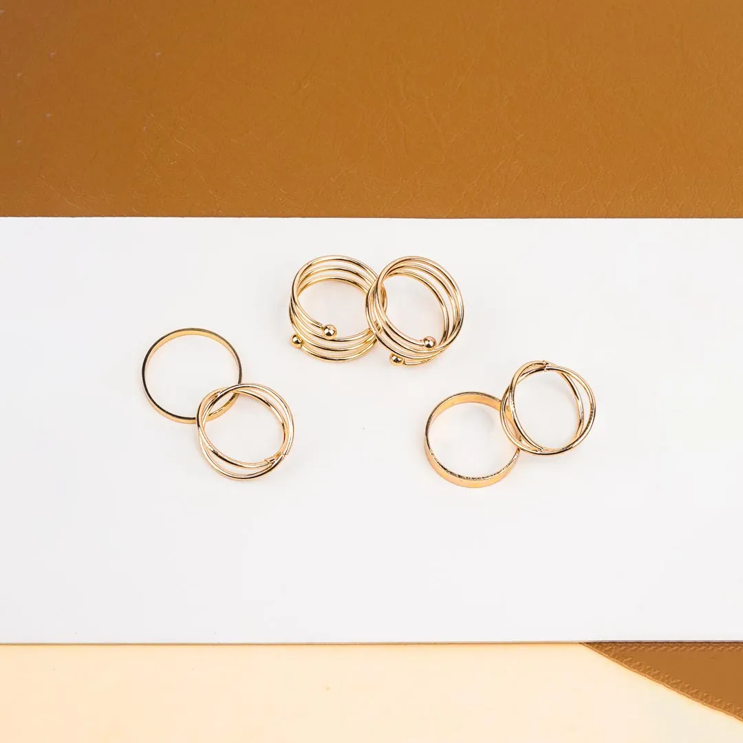 Set of six gold-toned rings featuring intricate openwork designs from abstract designed ring, plain ring to spiral design.