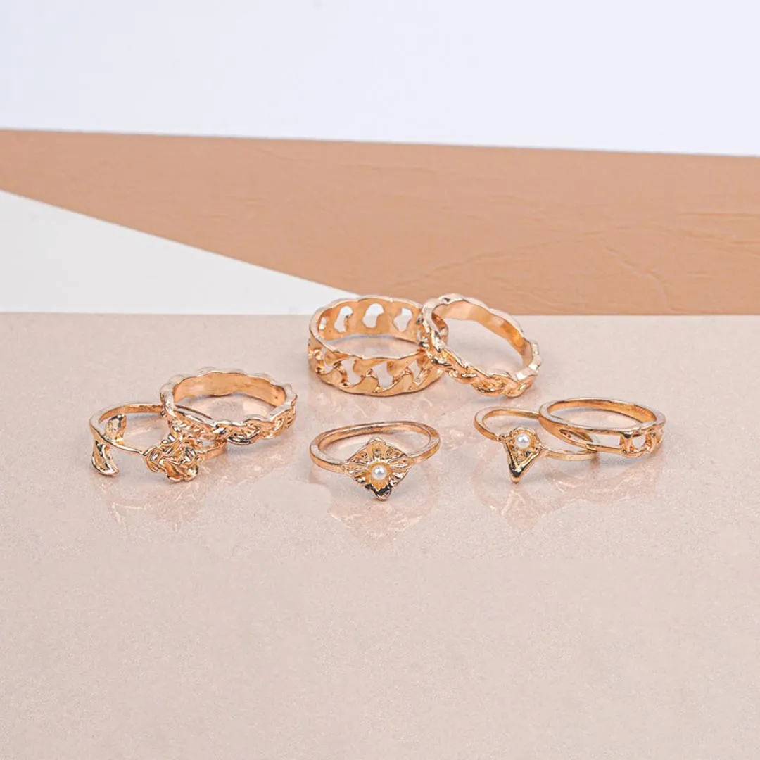 Set of seven gold-toned rings featuring intricate openwork designs from heart shaped, floral, textured, abstract designed ring. Elegant and cool looking set