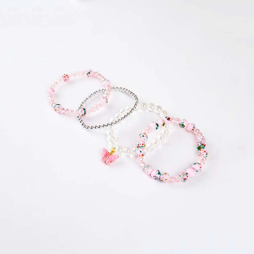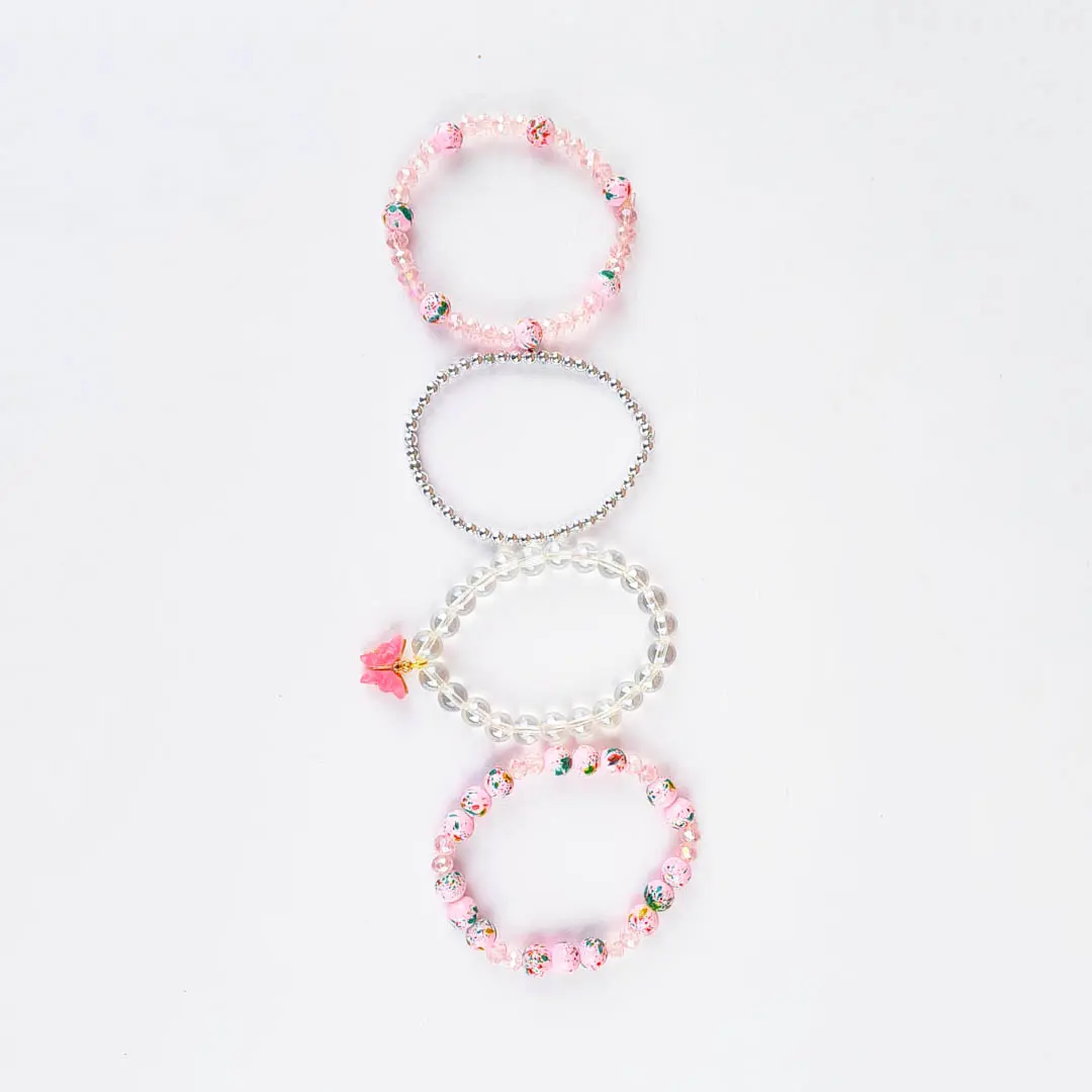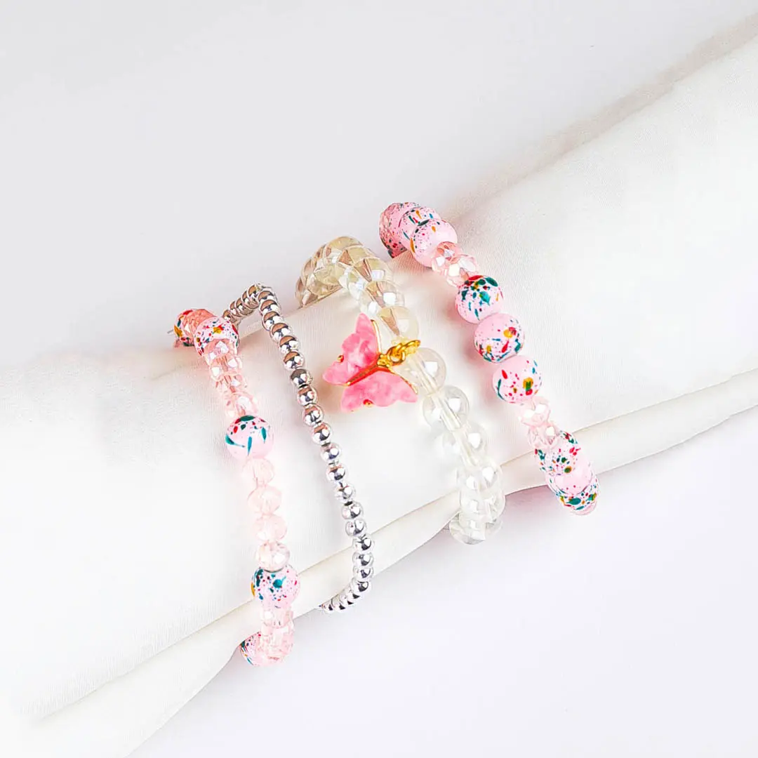 Pack of four pastel-hued stretch bracelets featuring glossy glass beads, hand-painted floral rounds, and metallic silver spacers. Includes a clear iridescent glass bracelet with a pink butterfly charm, pink and purple crackle effect beads, and painted pink beads for playful shine. Designed to be layered or worn solo.