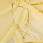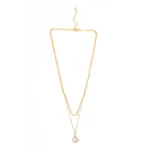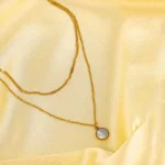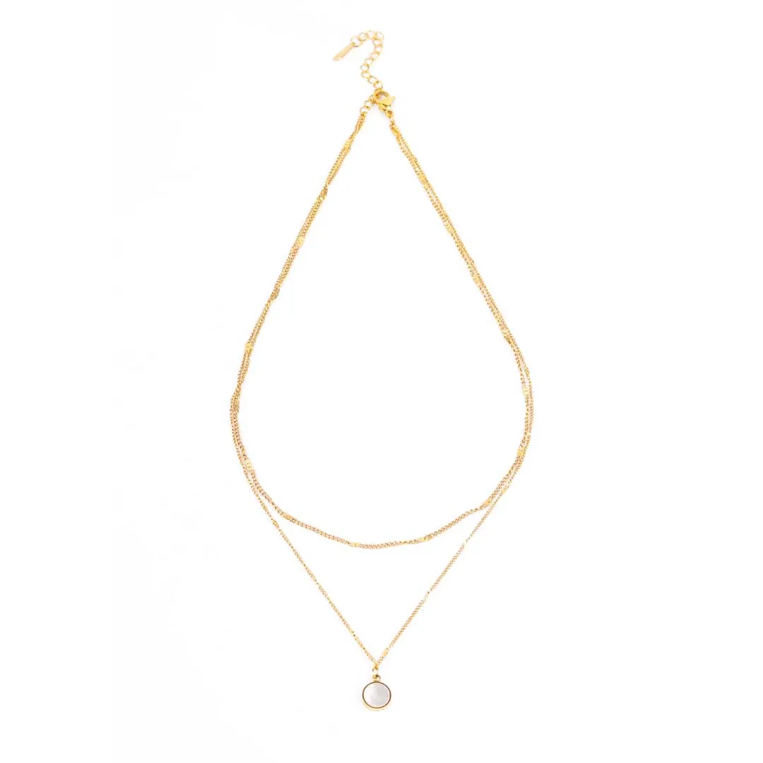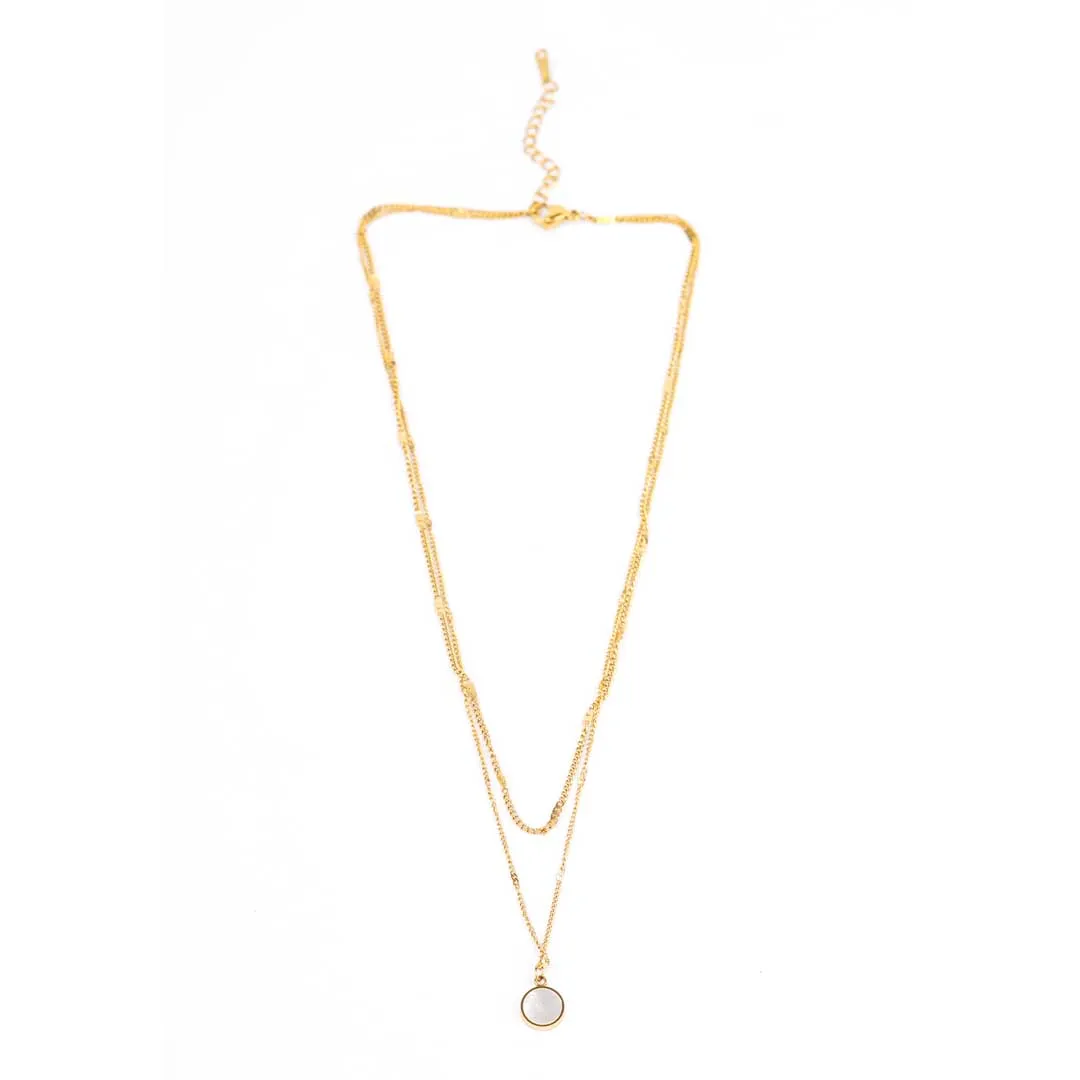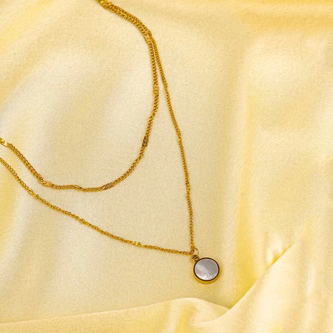 Golden layered chain necklace with a small round mirror white pendant having a lobster clasp