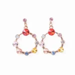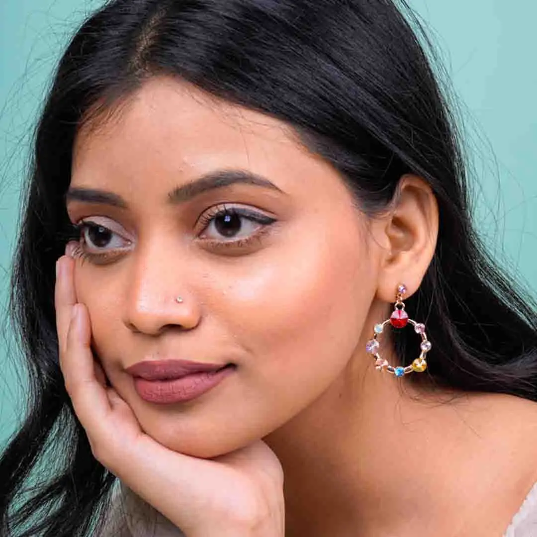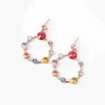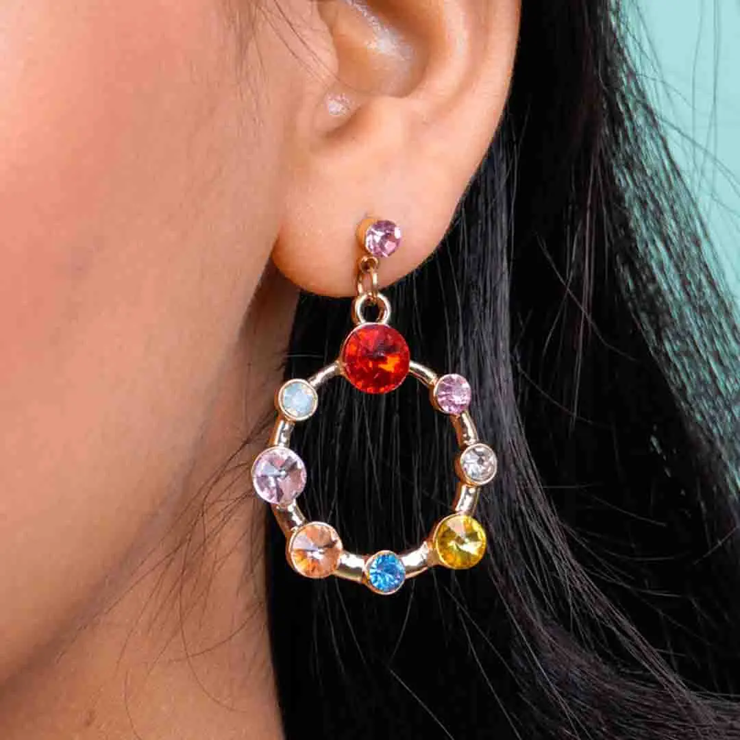 Golden hoop earring adorned with round colorful gemstones and push back closure