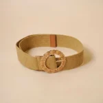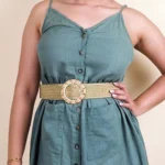 Textured woven straw belt in a natural beige colour featuring a woven circular flower shaped buckle with gold tone finish.