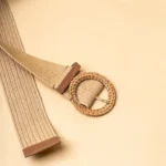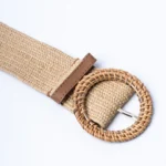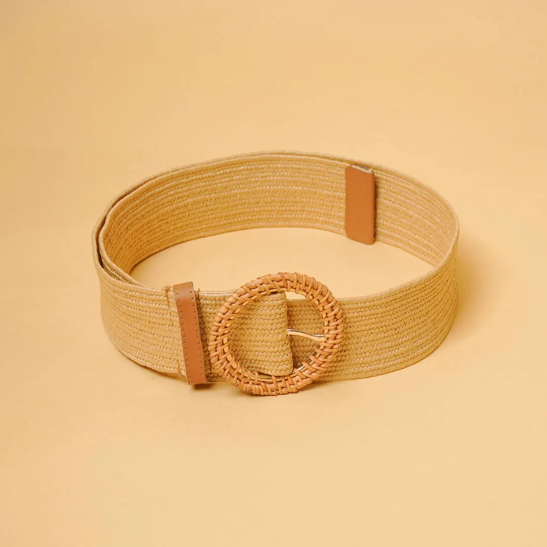 Textured woven straw belt in a natural beige colour featuring a woven circular shaped buckle
