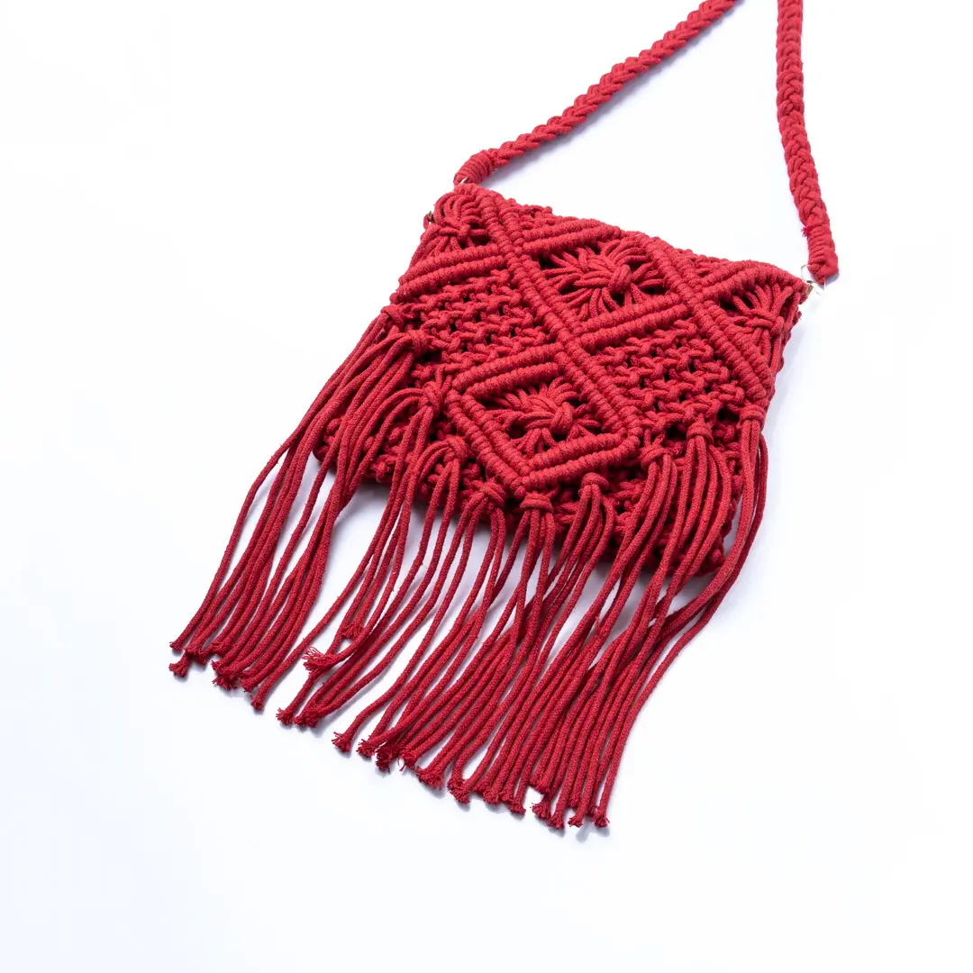 Macrame crossbody bag in dark red colour featuring detailed knotted patterns and a fold-over flap with long fringe accents adorned with long braided strap