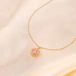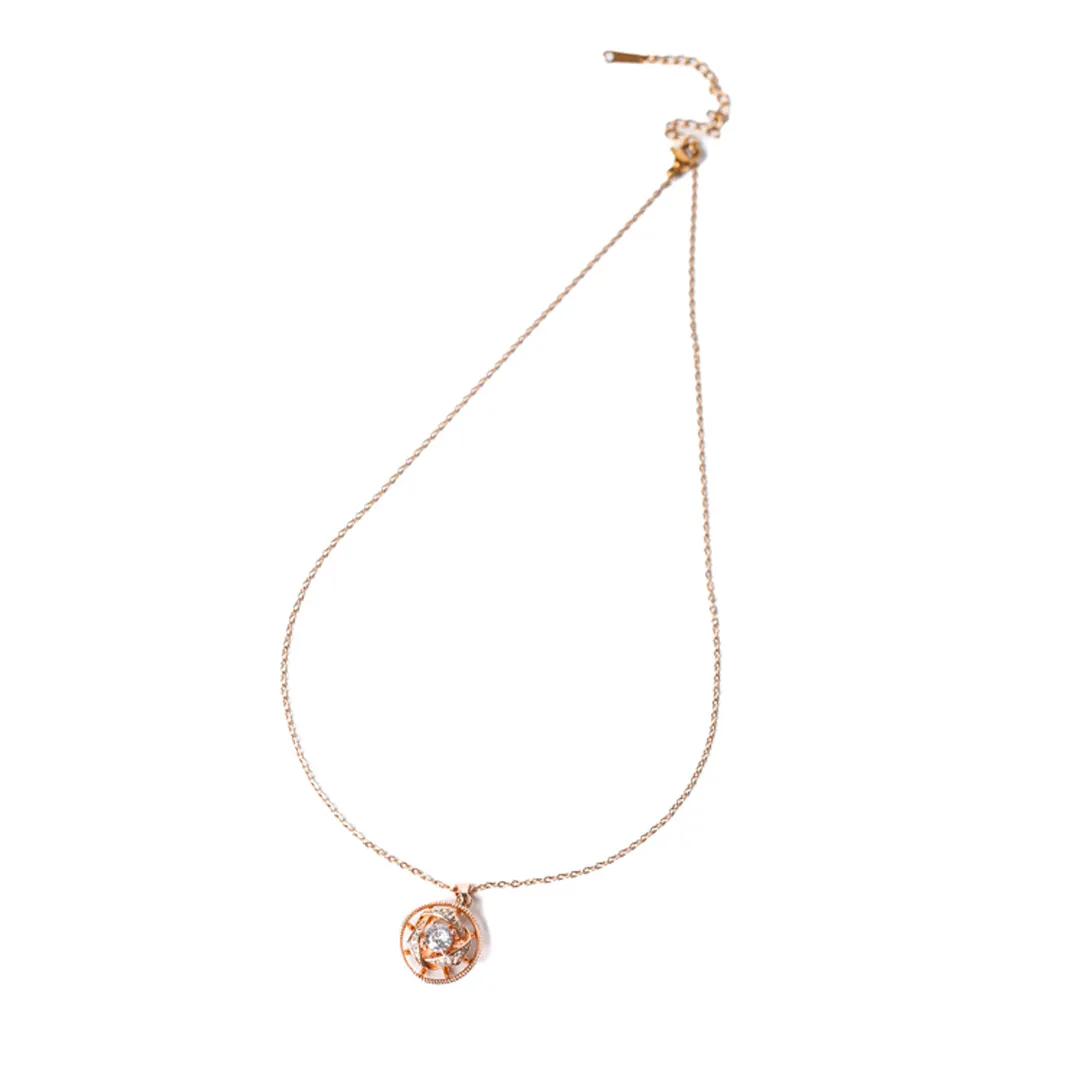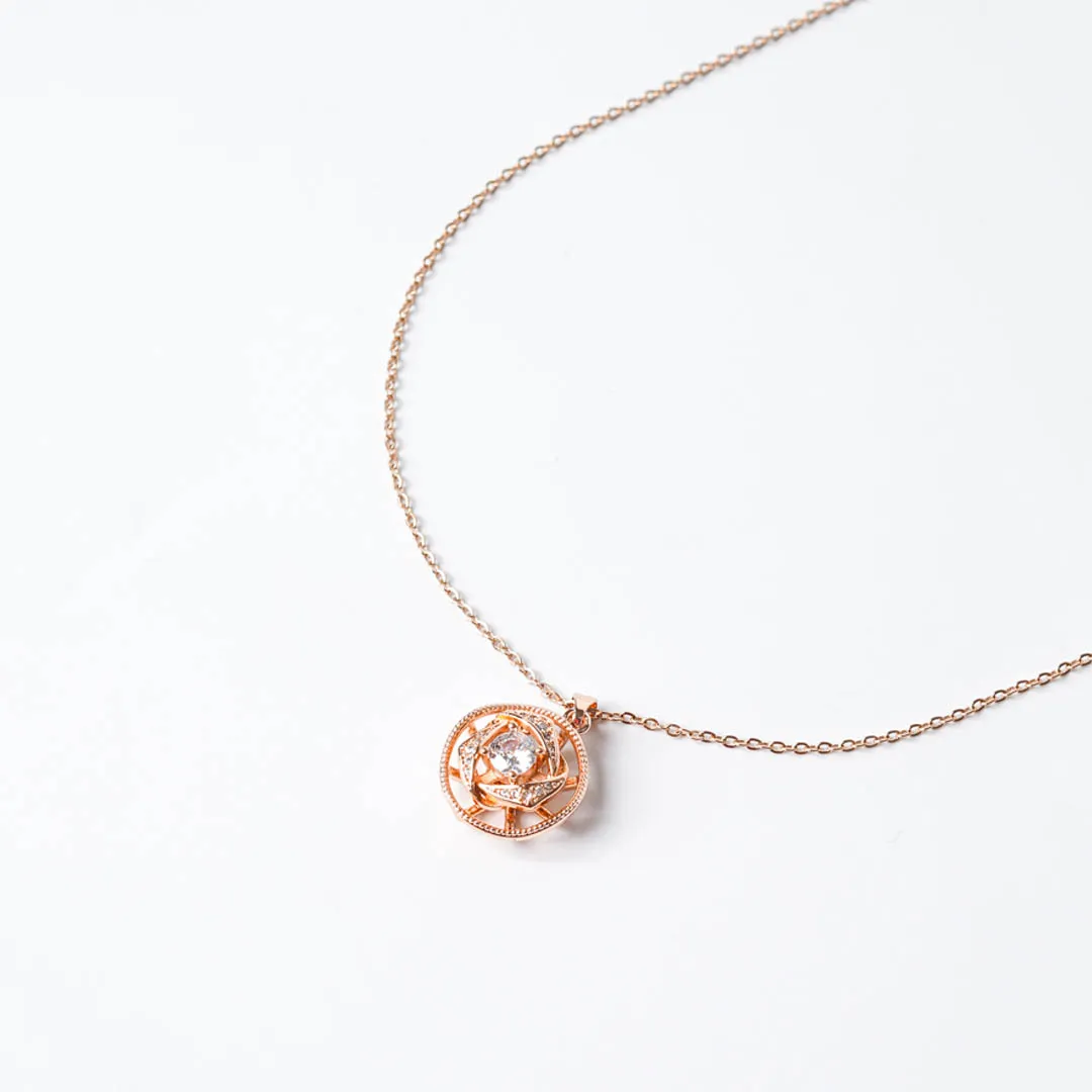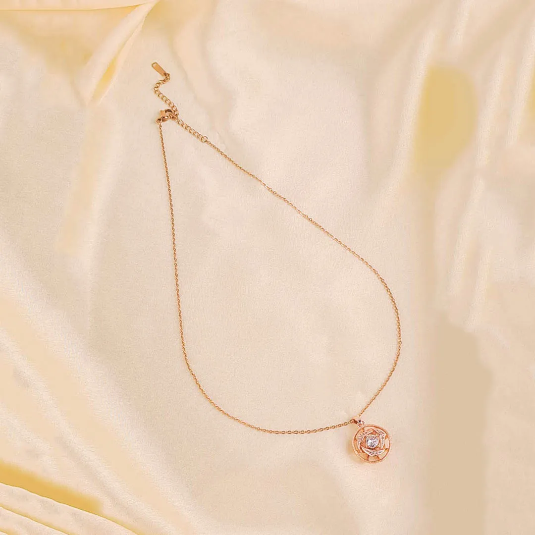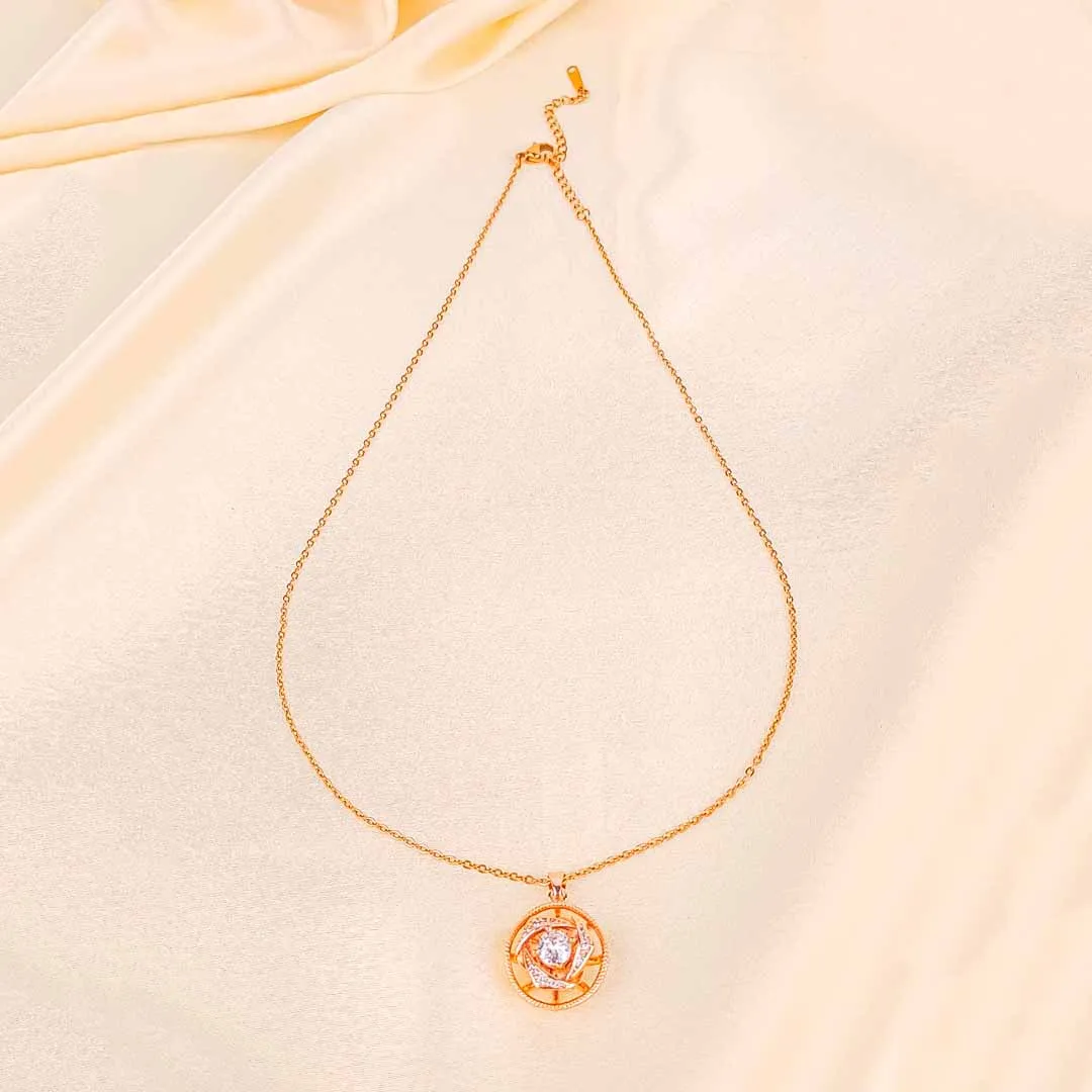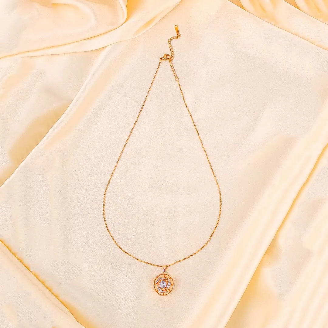 Golden tone metal curb chain necklace adorned with spinning flower shaped pandent with a clear stone placed in the centre and a lobster claw clasp