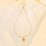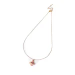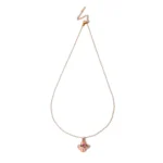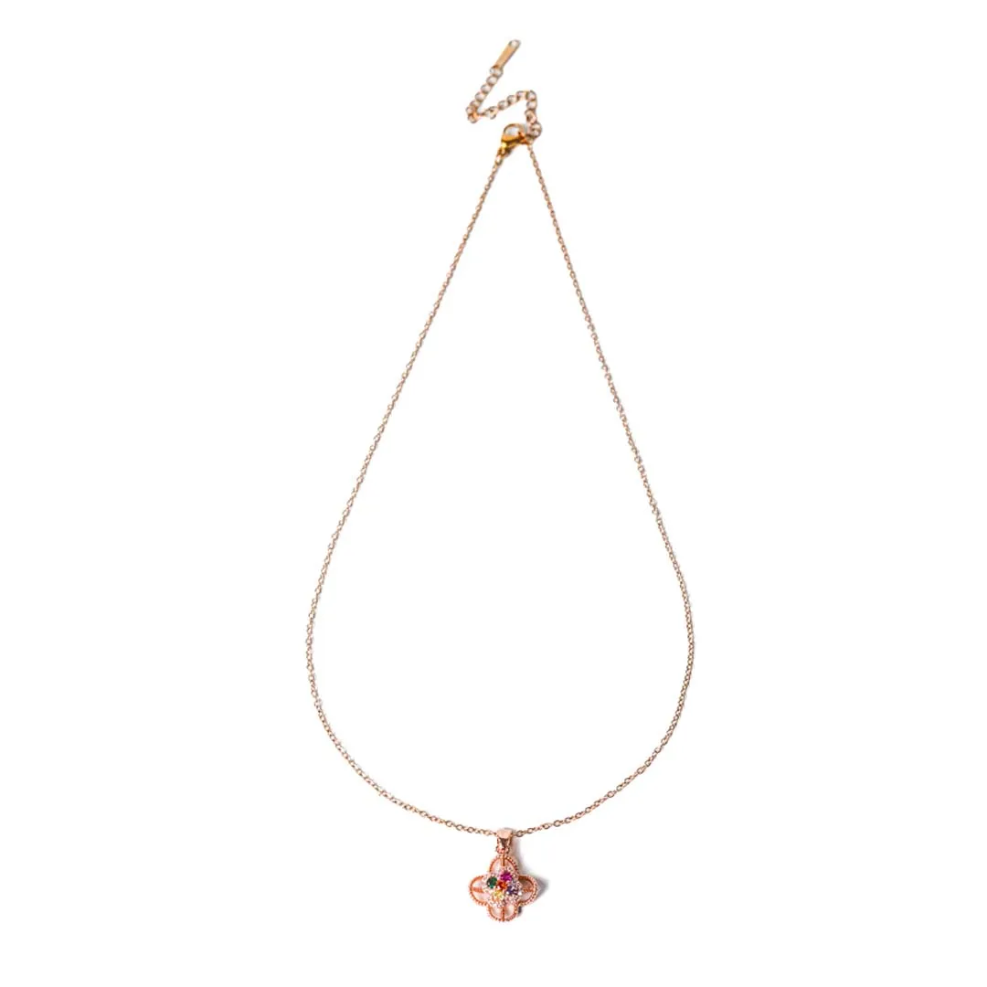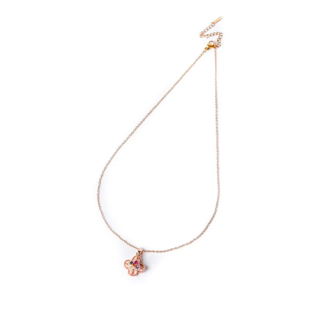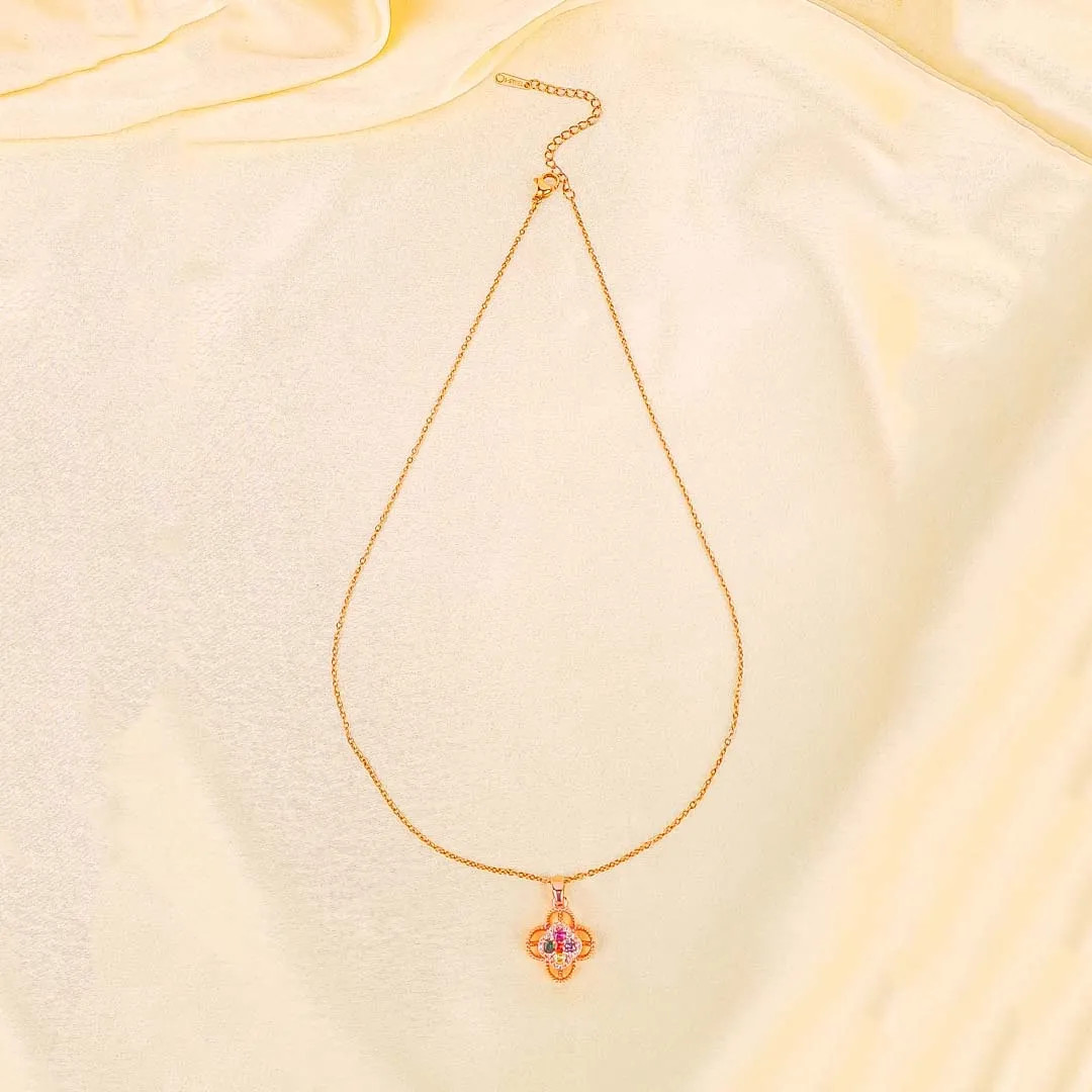 Rose gold tone metal curb chain necklace adorned with spinning flower shaped pandent with colourful stone placed in the centre and a lobster claw clasp