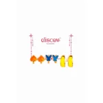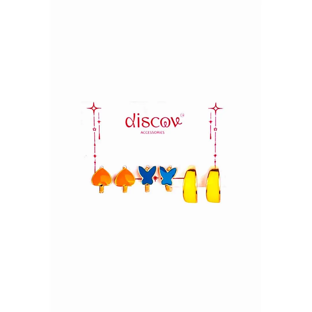 Chic hoop earring set with orange enamel hearts, yellow enamel arcs, and turquoise enamel butterflies, all crafted in gold-plated metal with a glossy finish and hinged closure for secure fit.