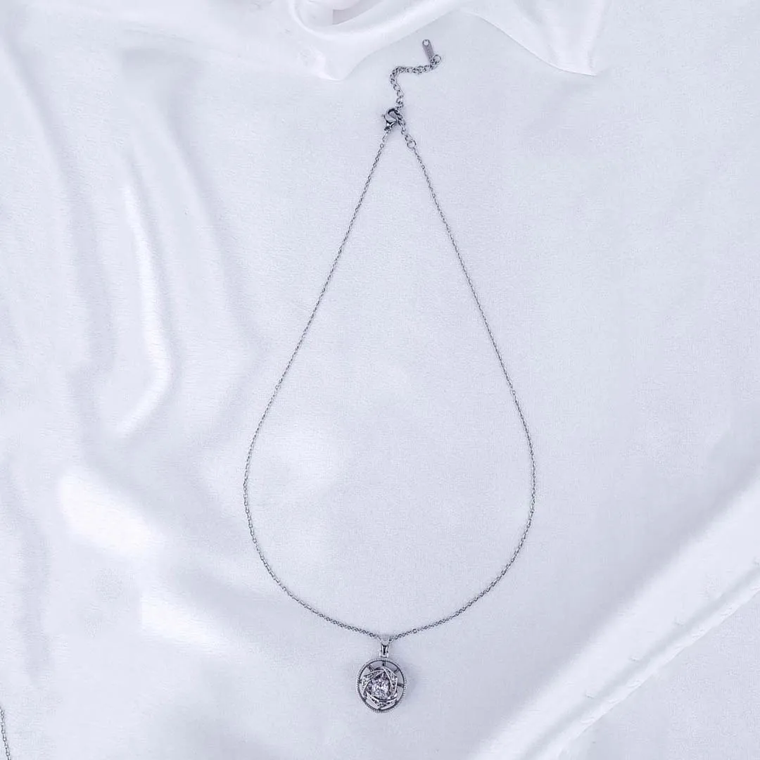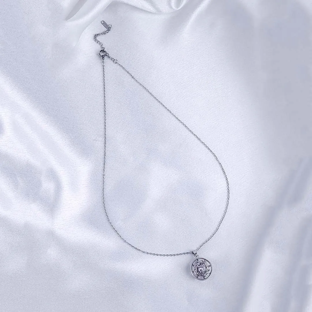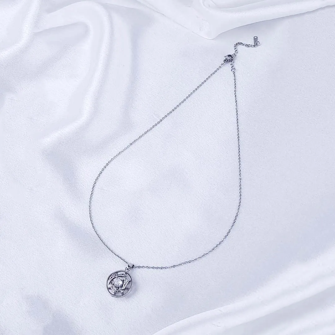 Silver tone metal curb chain necklace adorned with spinning flower shaped pandent with a clear stone placed in the centre and a lobster claw clasp