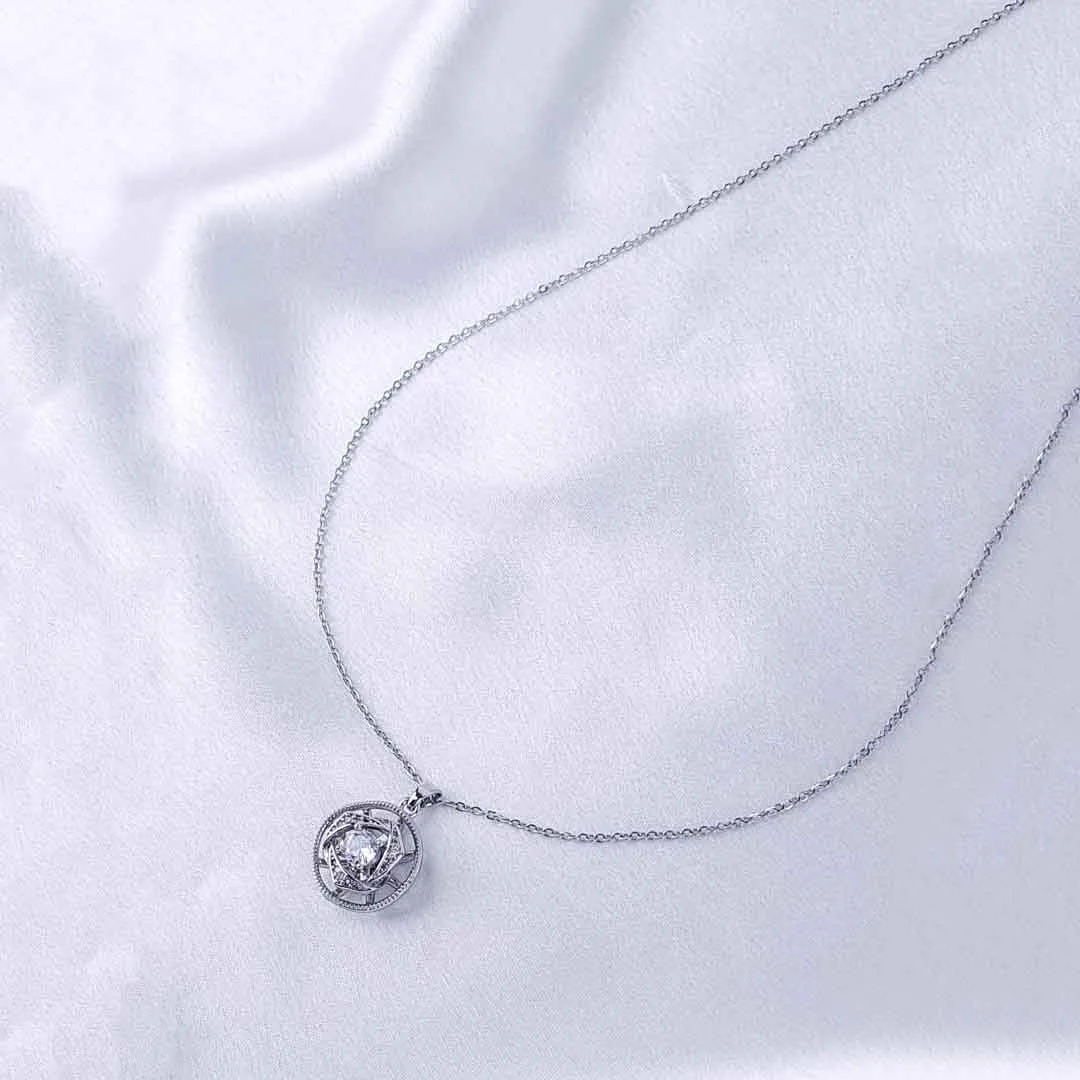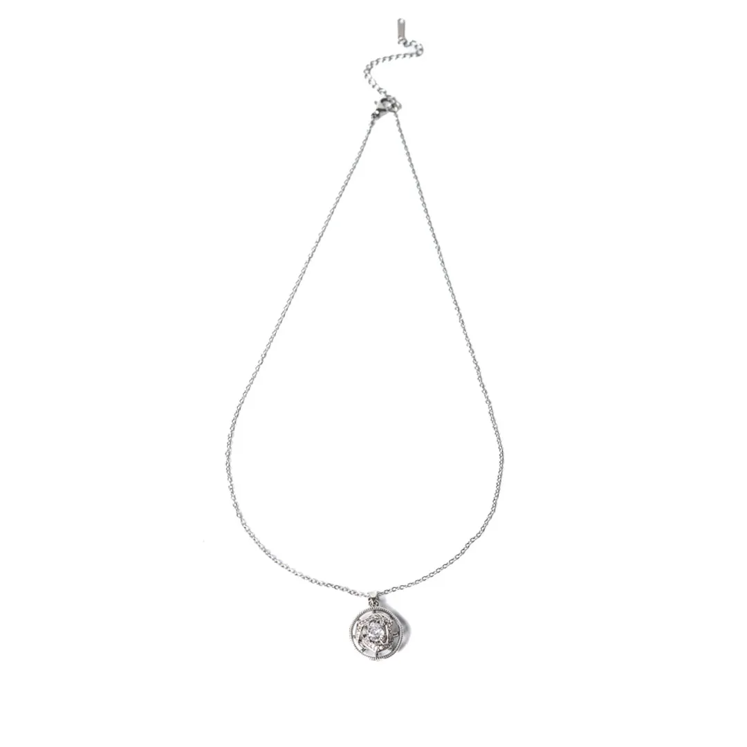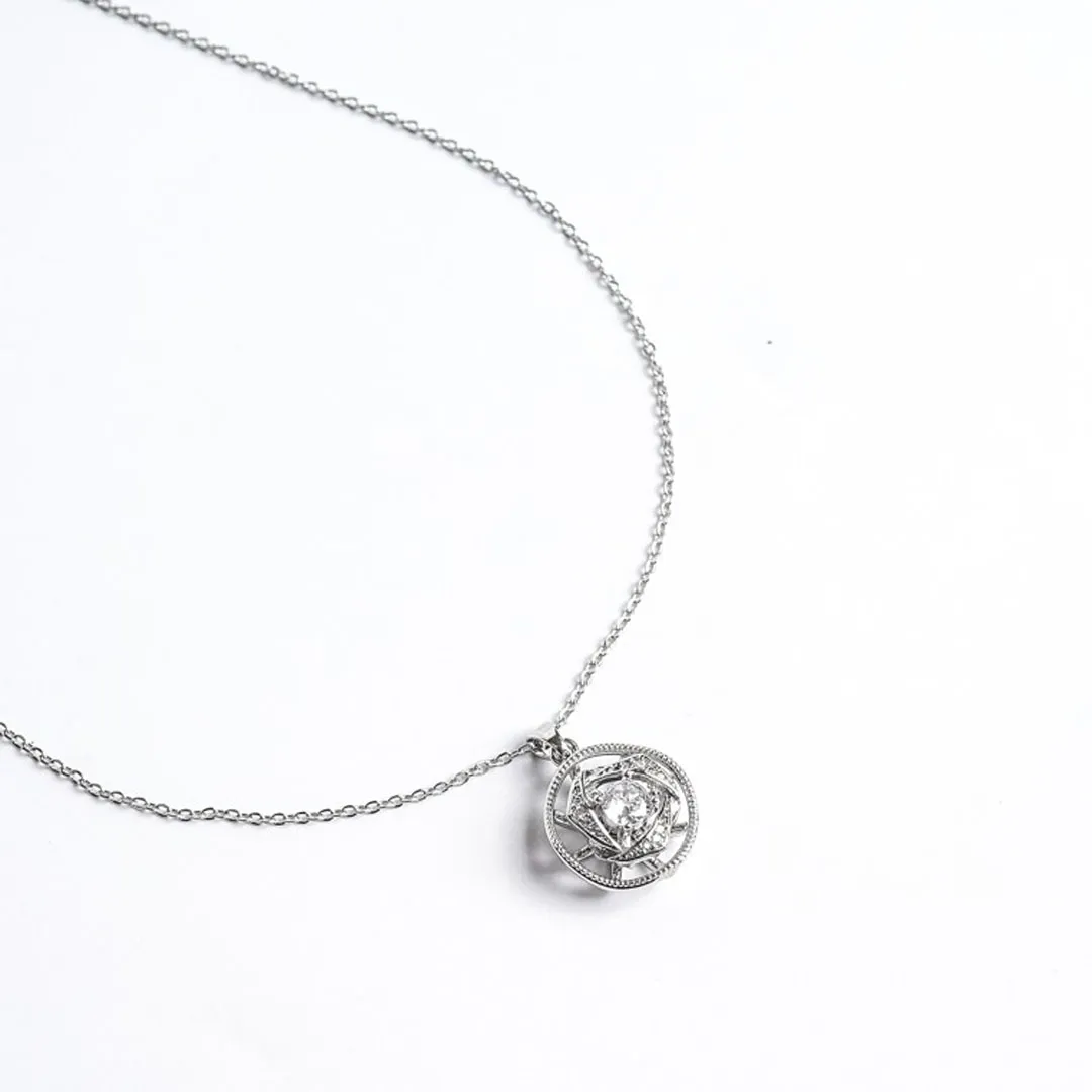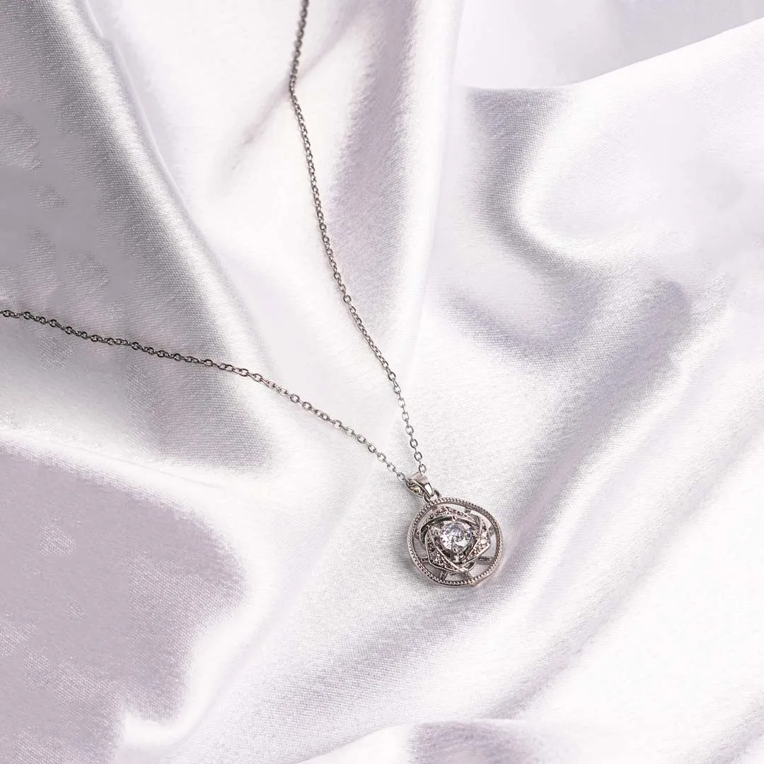 Silver tone metal curb chain necklace adorned with spinning flower shaped pandent with a clear stone placed in the centre and a lobster claw clasp
