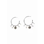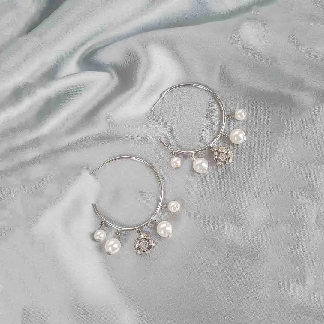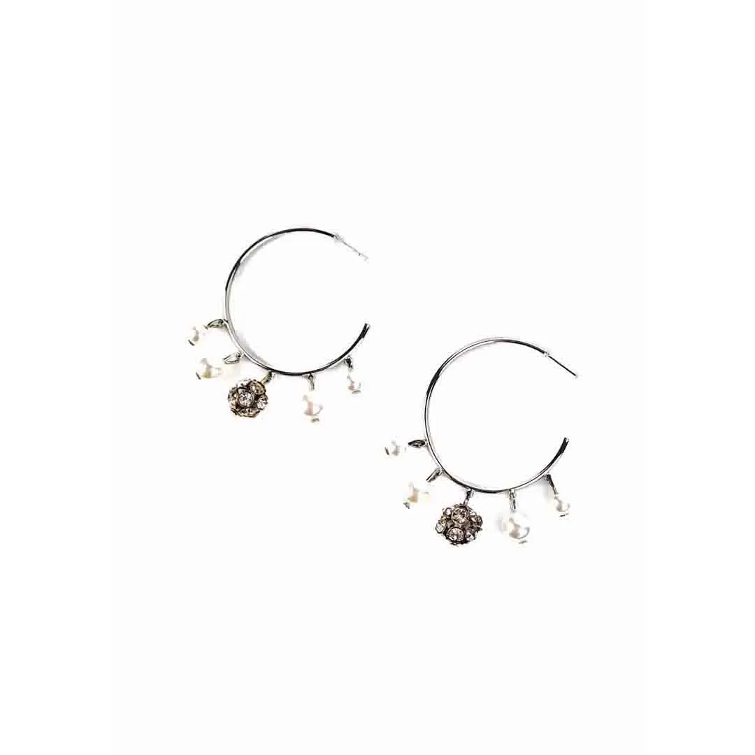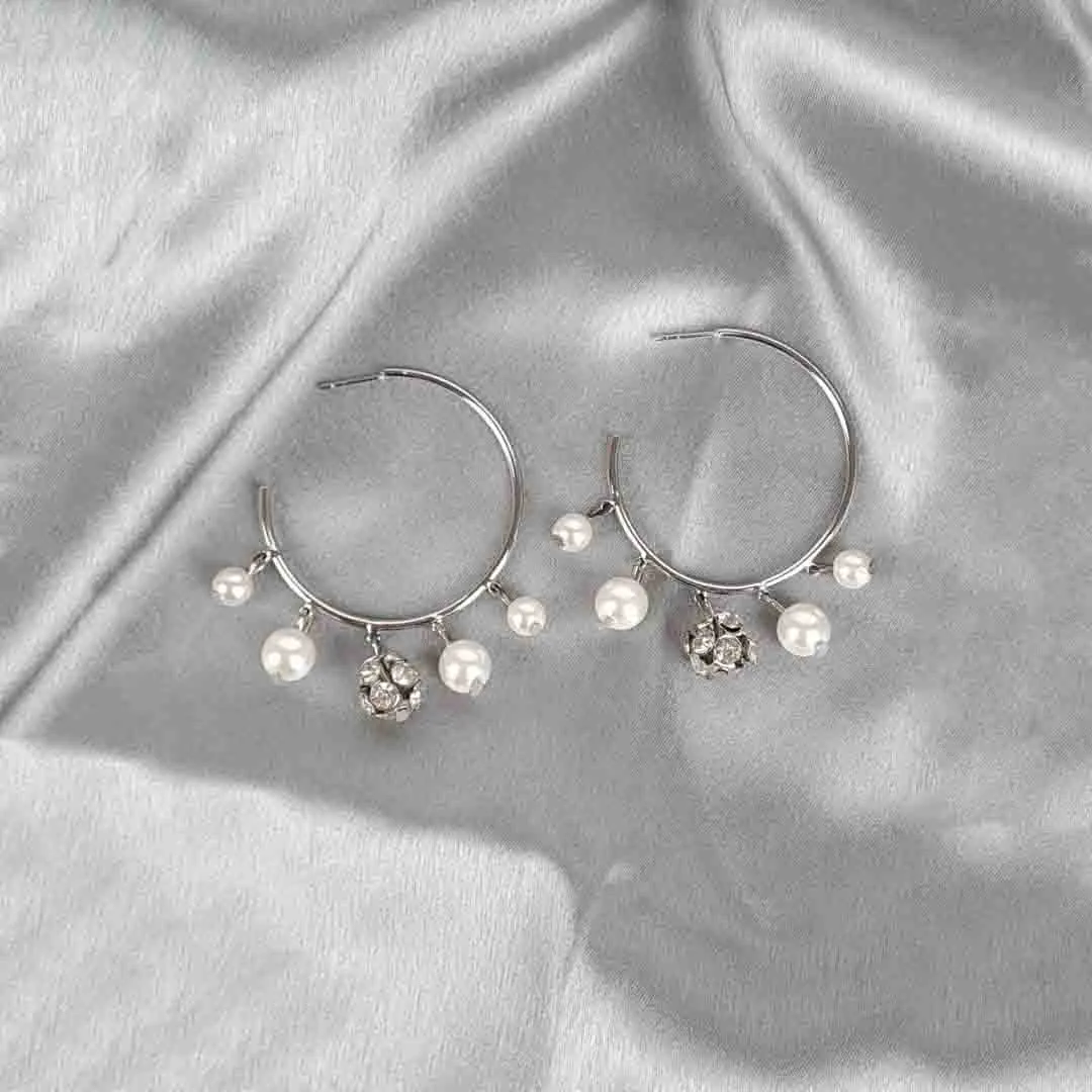Silver-tone hoop earrings adorned with dangling pearls and sparkling crystal charms, creating a delicate mix of elegance and sparkle. The hoops feature a smooth polished finish and secure push-back posts for comfortable wear.