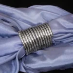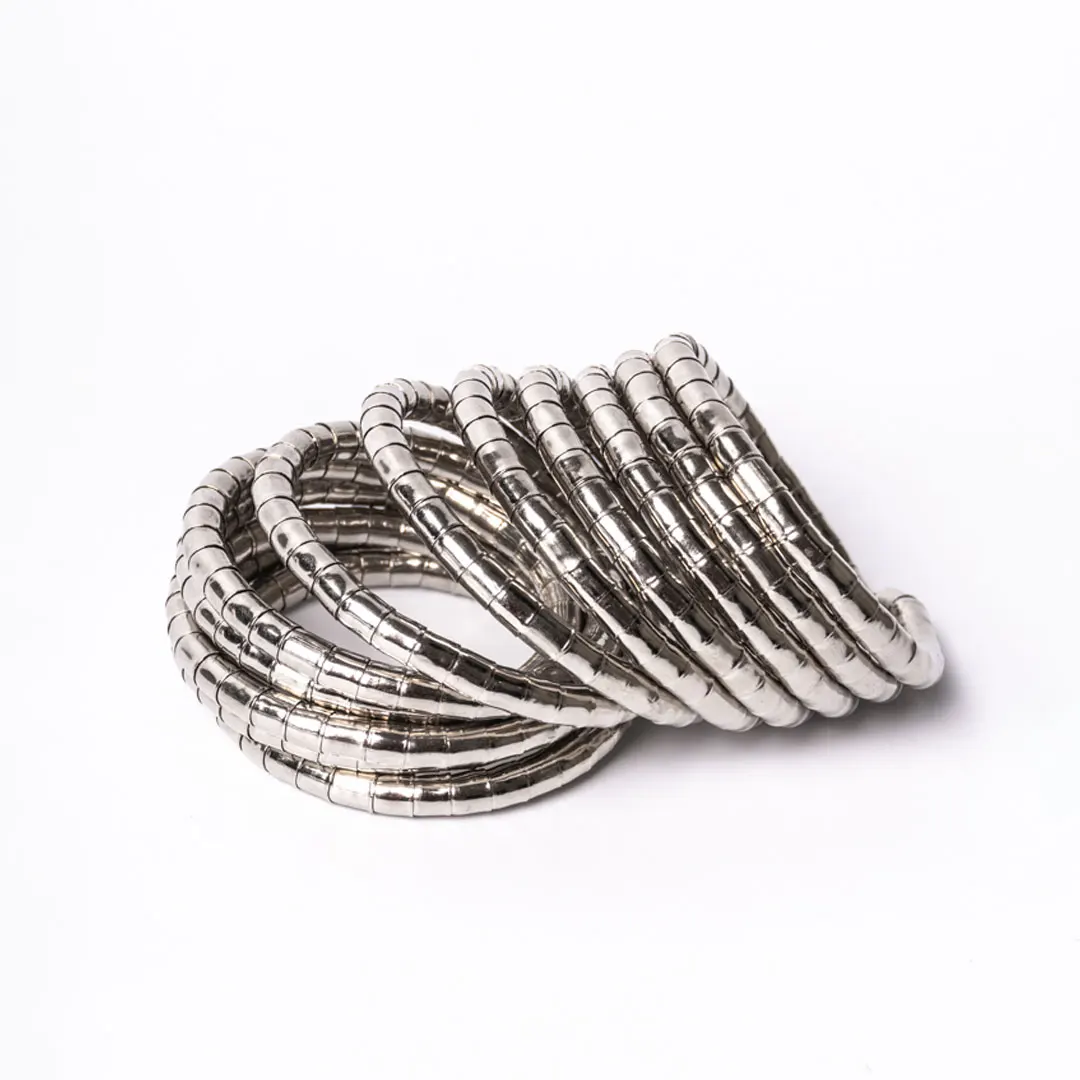Multi layered metal spiral bracelet with textured polished silver finish featuring two small circular beads on both the edges