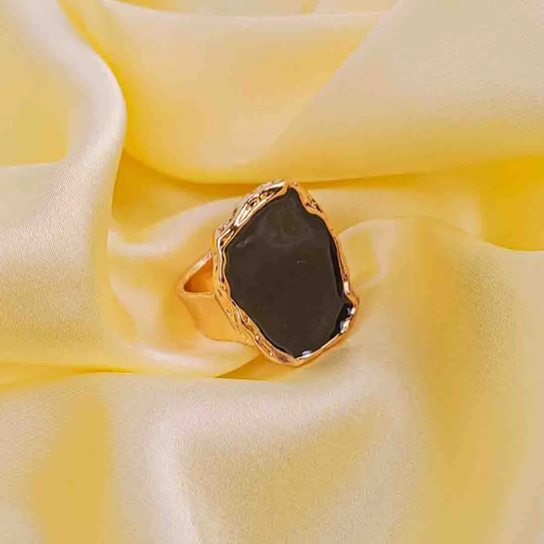 Contemporary ring showcasing a bold, irregularly shaped black stone set in a textured metallic bezel, finished with a smooth band for a striking modern touch.