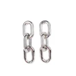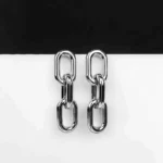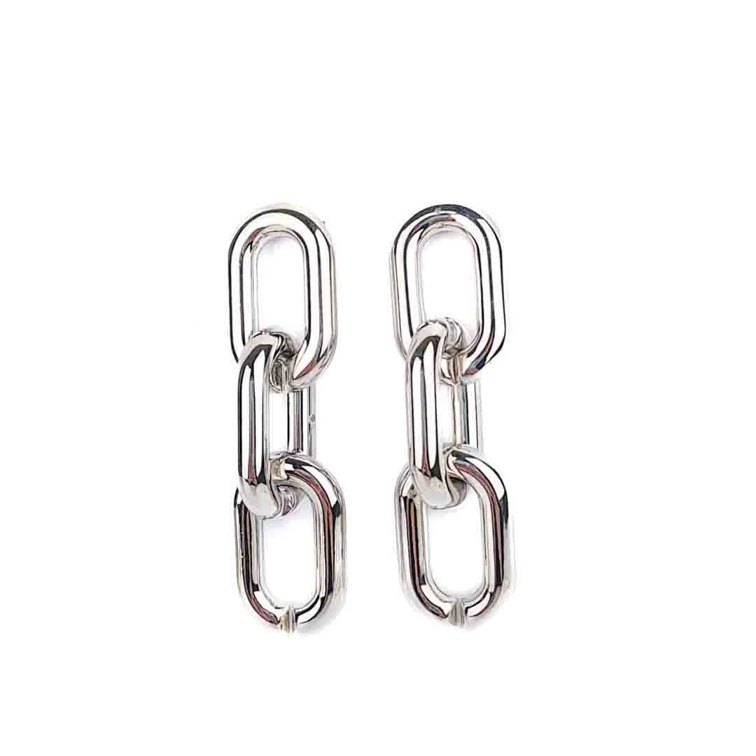 Geometric chain link drop earrings in polished silver-tone metal, featuring bold chunky links and a smooth high-gloss finish; designed with a secure post-back closure for a striking contemporary look.