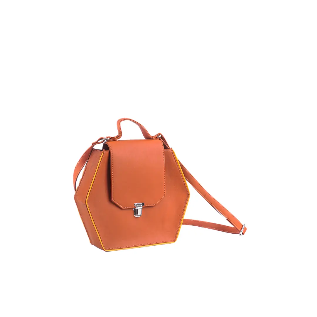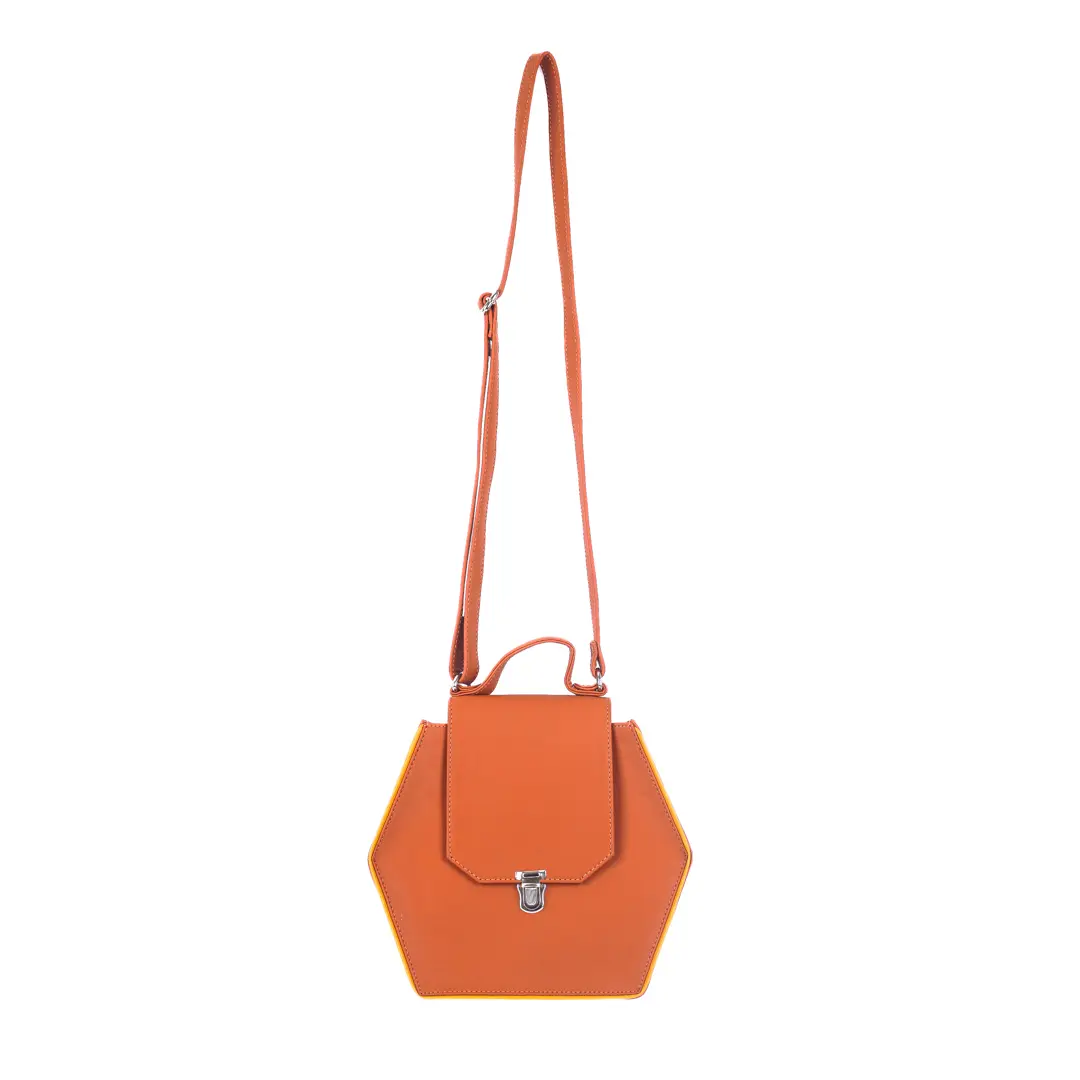 Hexagon shaped crossbody vegan leather bag in a warm earthy brown shade with yellow piping along the edges made of vegan leather featuring a front flap with a magnetic snap closure in a silver tone finish