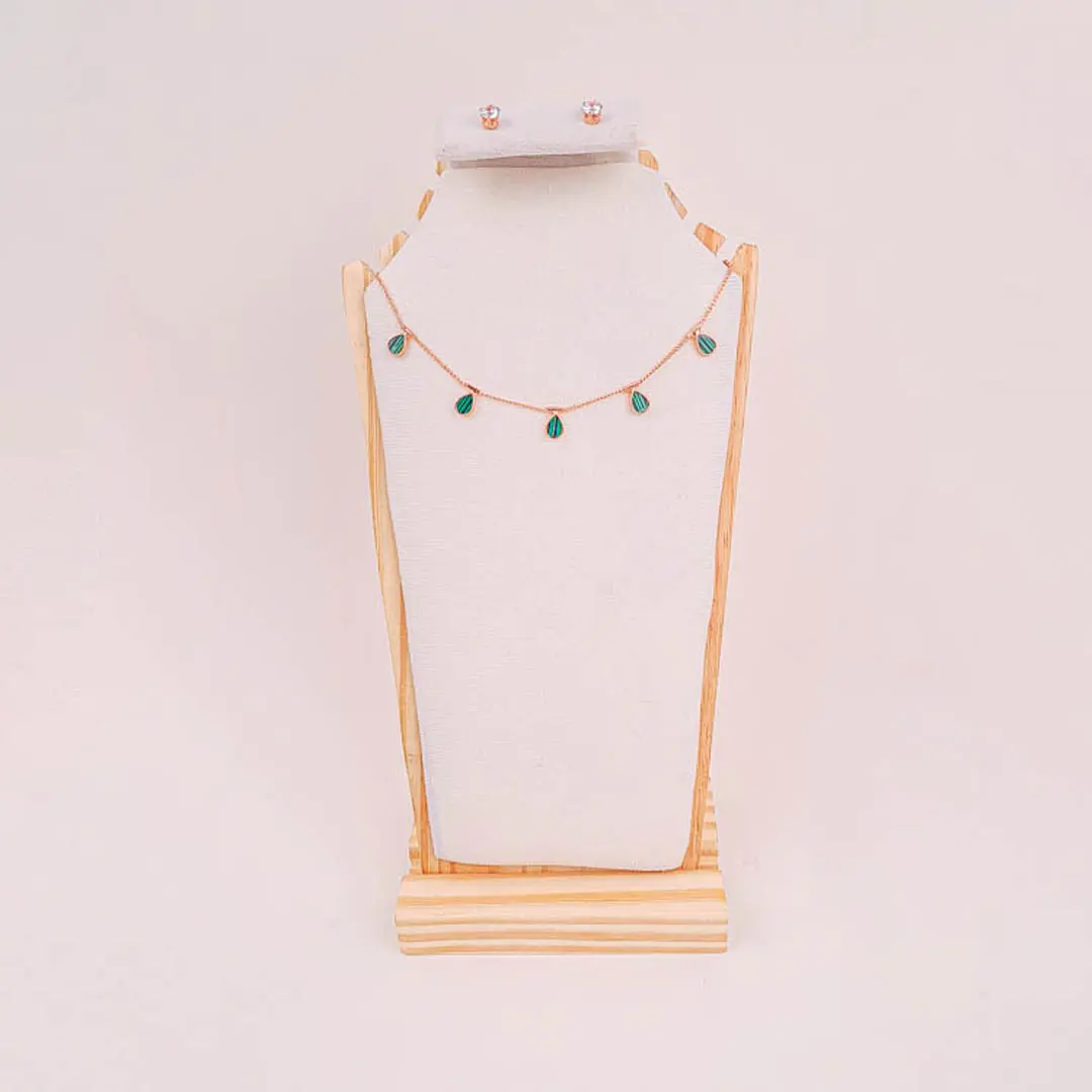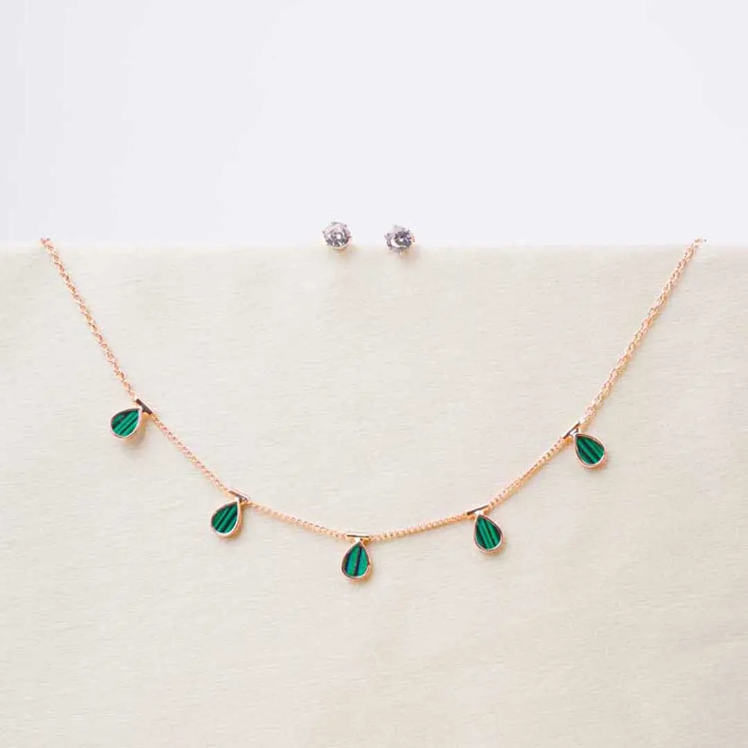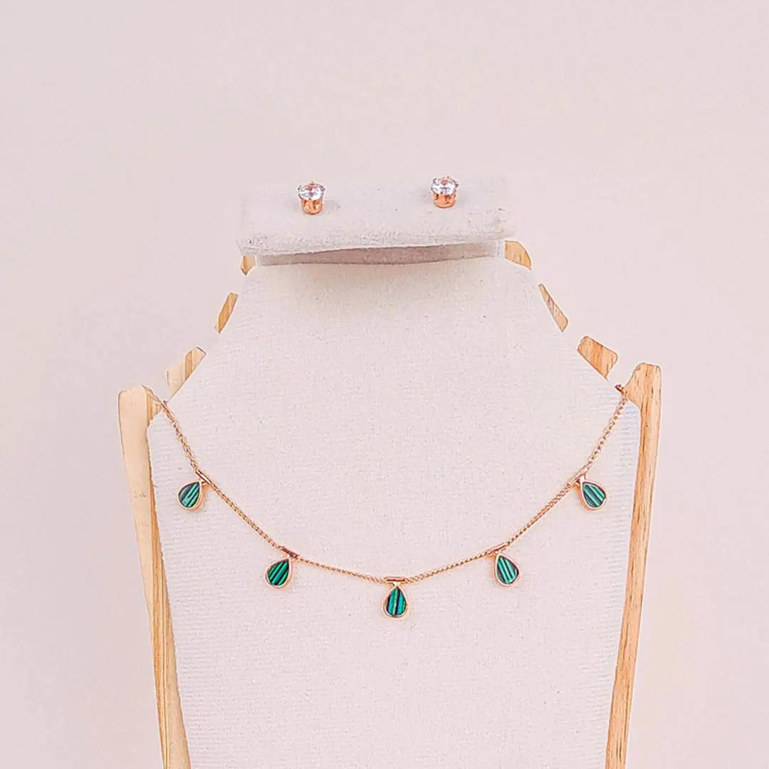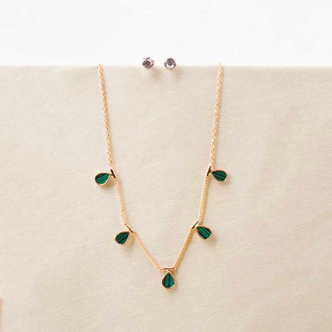 Set of accessories consists of a delicate gold-toned necklace adorned with small teardrop-shaped green charms along with a pair of stud earrings embellished with a small clear gemstone