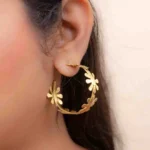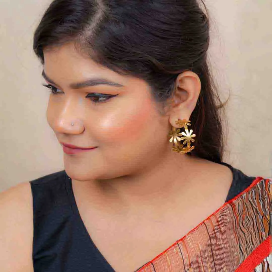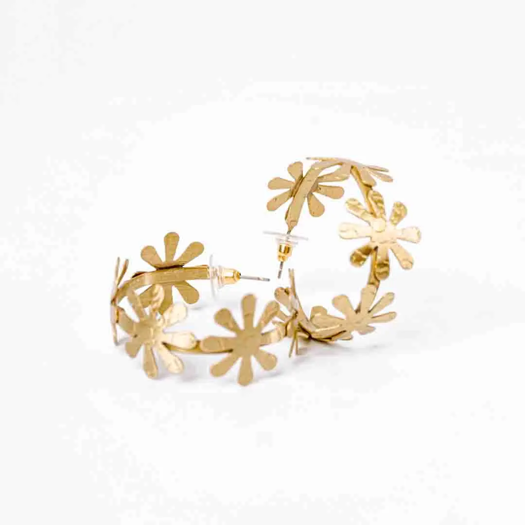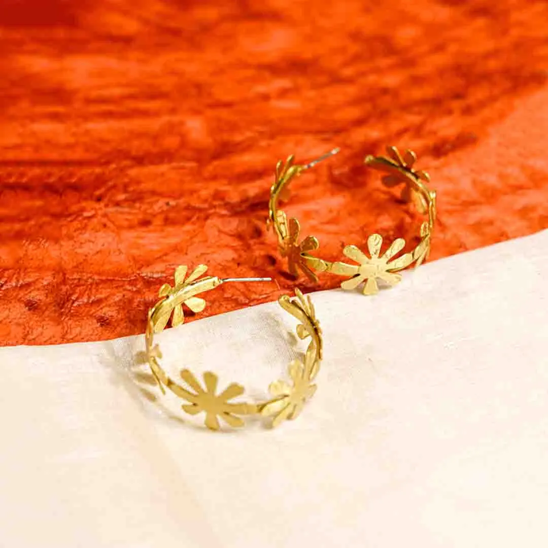 C hoop brass earring featuring flower shaped continuous pattern and a push back closure