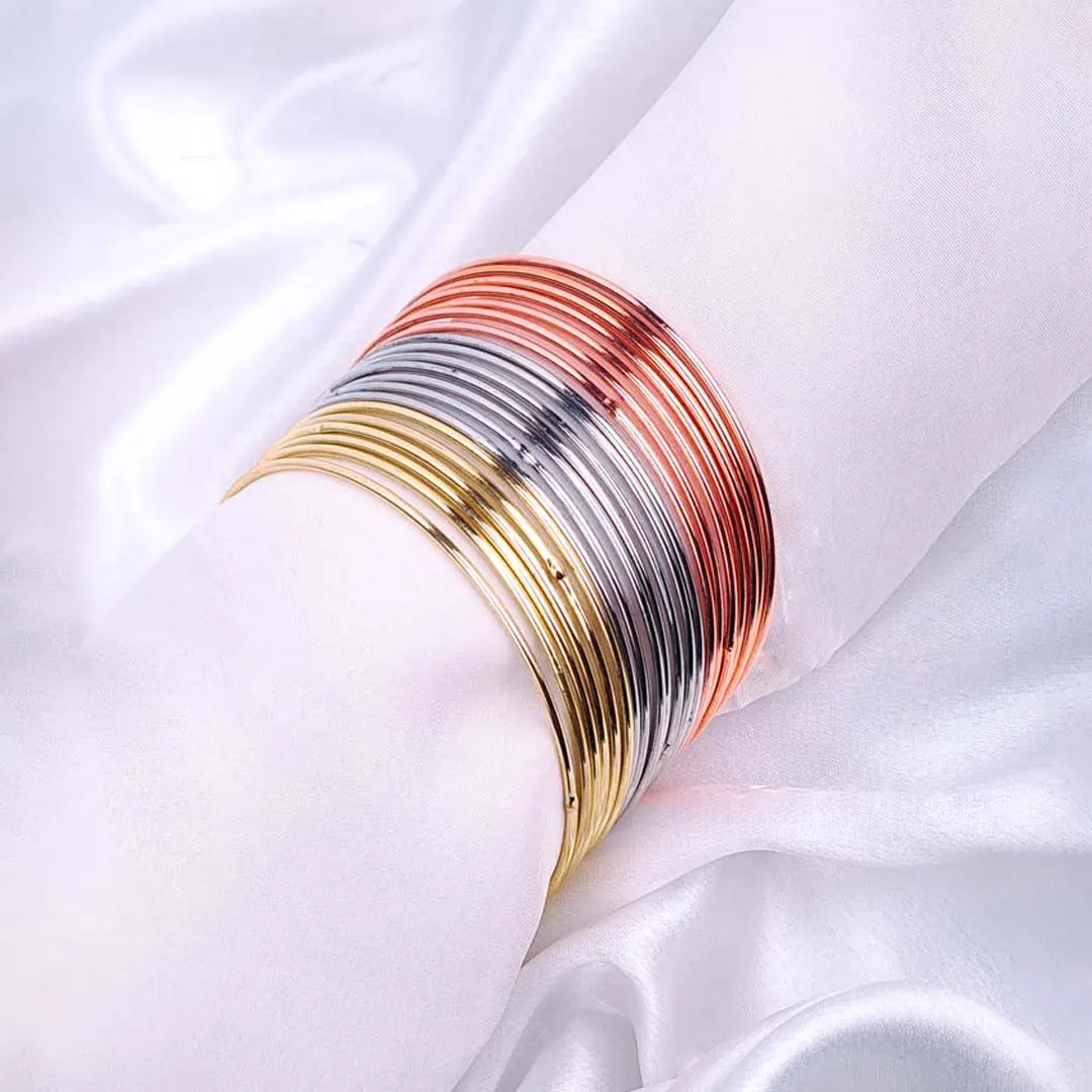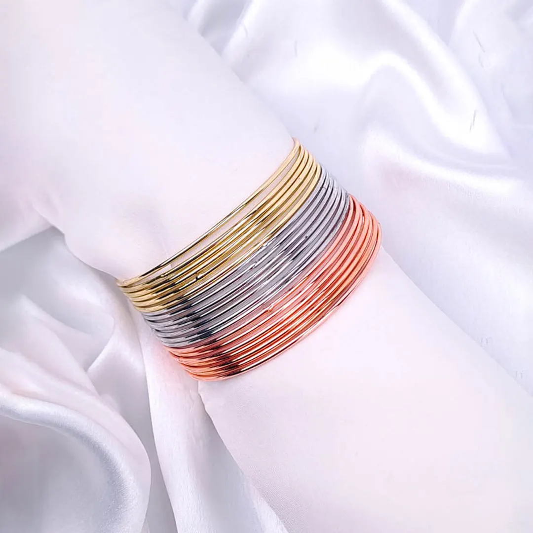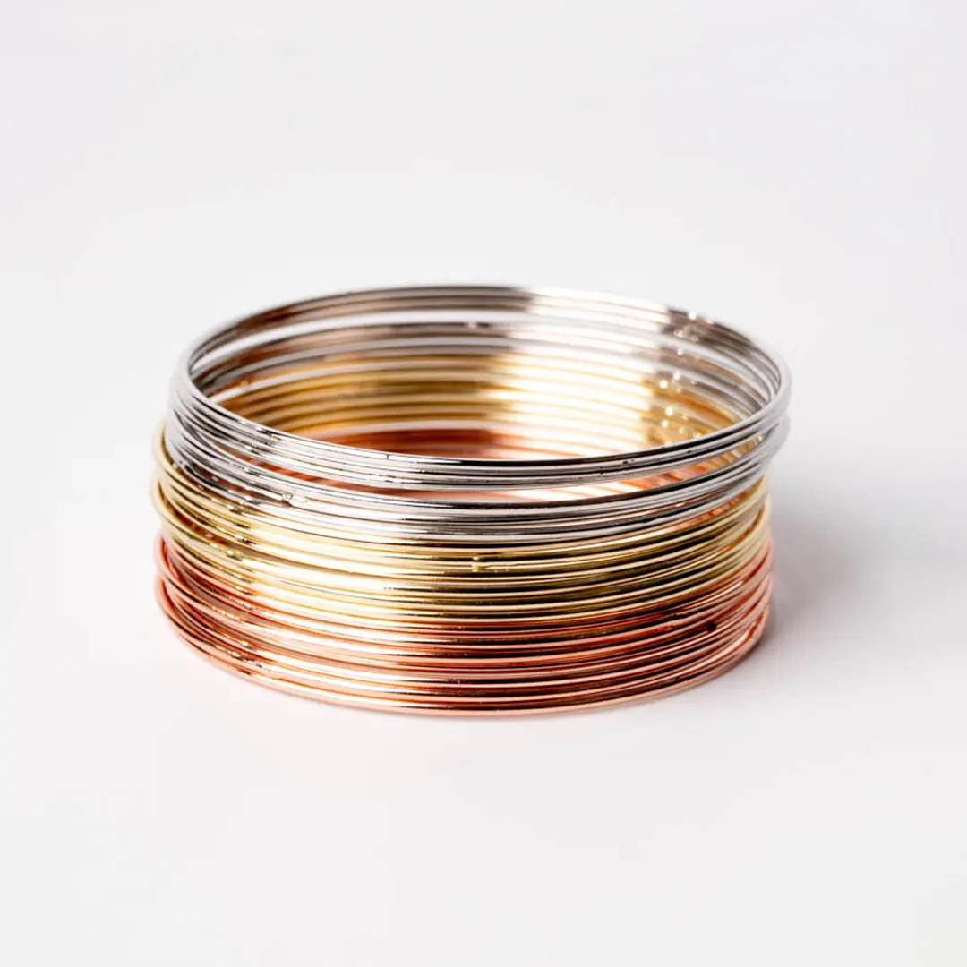 Set of thin metallic bangles featuring tricolor gradient with silver, gold, and copper tones
