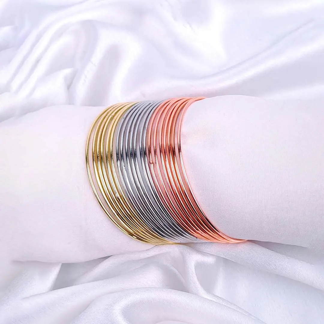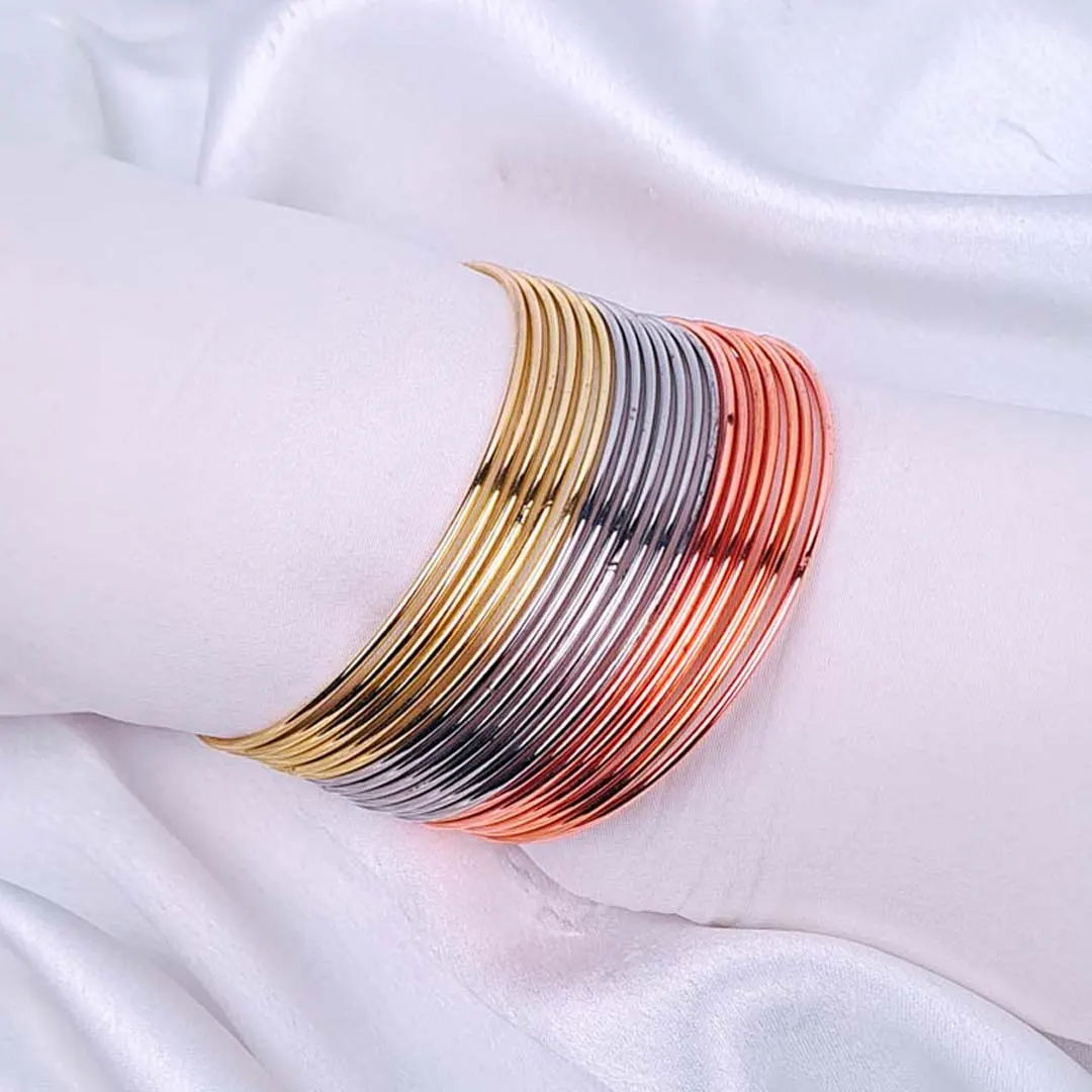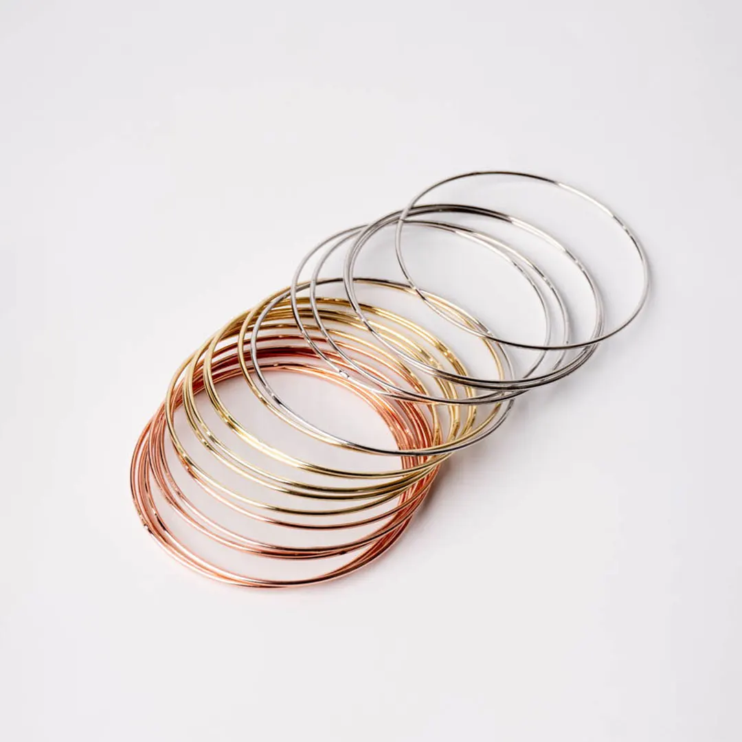 Set of thin metallic bangles featuring tricolor gradient with silver, gold, and copper tones