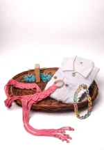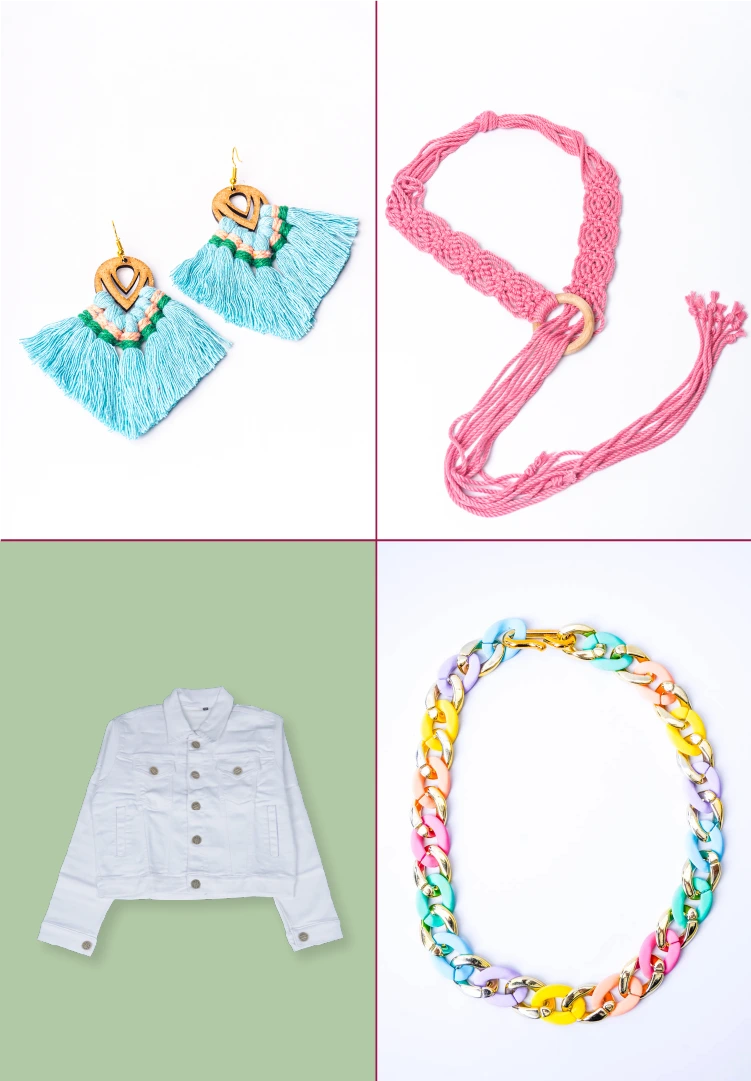 White denim, Pink Macrame belt and a vibrant Necklace along with Macrame earrings. A combination to go with out outfit and make you feel estatic.